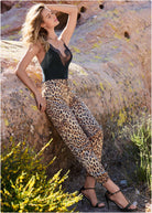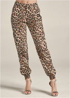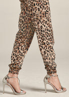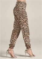 Faux suede fabricates these animal print cargo pants, dressing up the casual styling. Gathered cuffs showcase your shoe of choice and highlight the looser fit of the legs, letting you tuck a fitted top into the high waist to create a dramatic silhouette. Cargo pockets add function to this playful pair! * Available in plus size * Print placement may vary * High waist with zipper/button closure * Cargo side pockets and front slit pockets * Gathered ankles * 31" inseam * Fabric does not have stretch * Poly/elastane. Imported