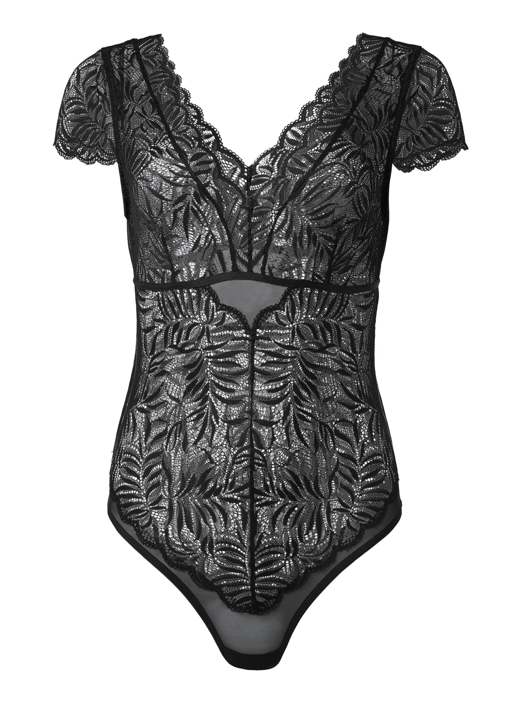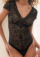 Be a sheer beauty in this botanical lace and mesh teddy. Cut in a cheeky, high-leg silhouette, this bare-it-all bodysuit is shaped with a V-neck front, ultra-low back and feminine cap sleeves, all finished with scalloped edges.