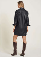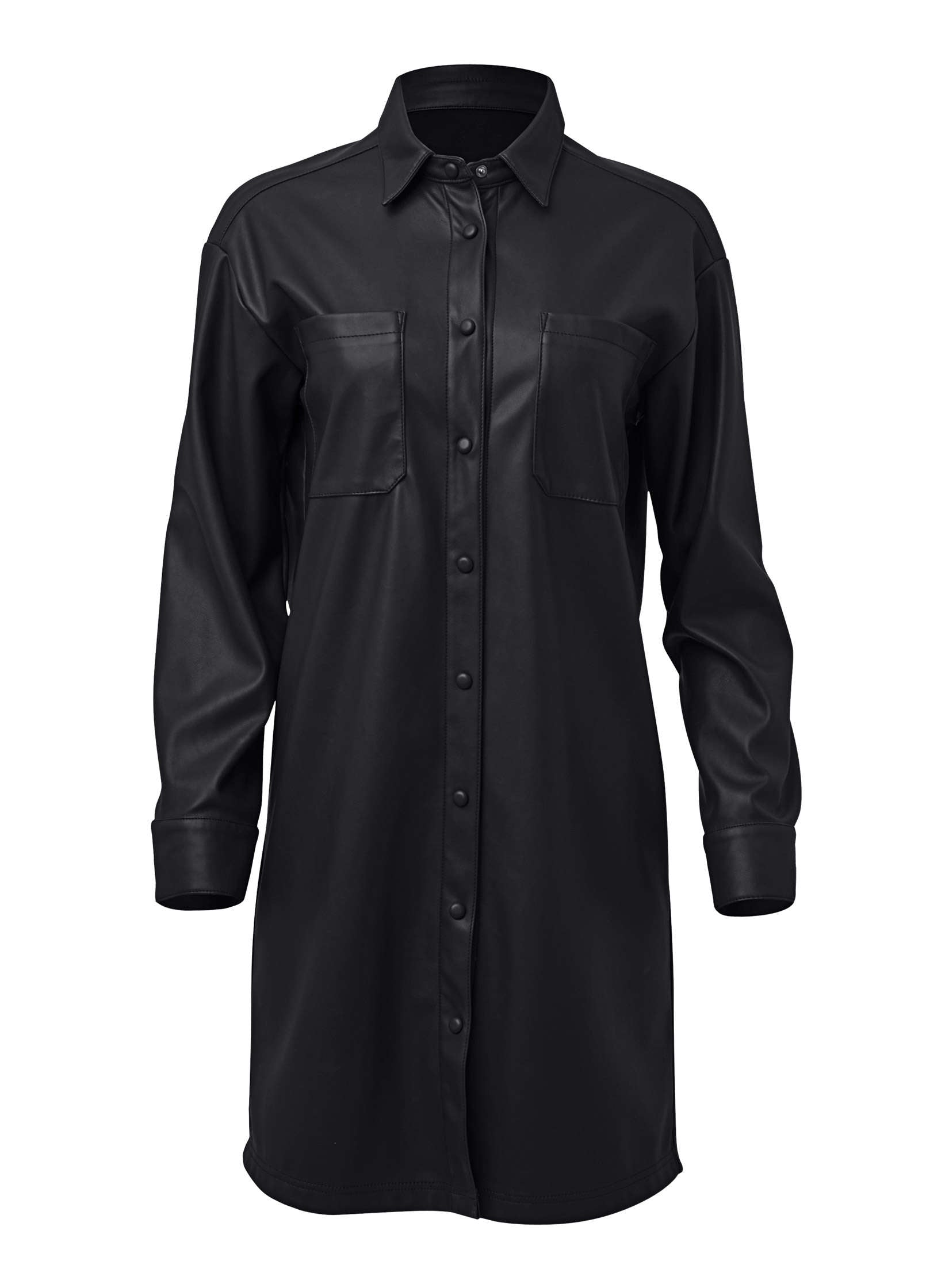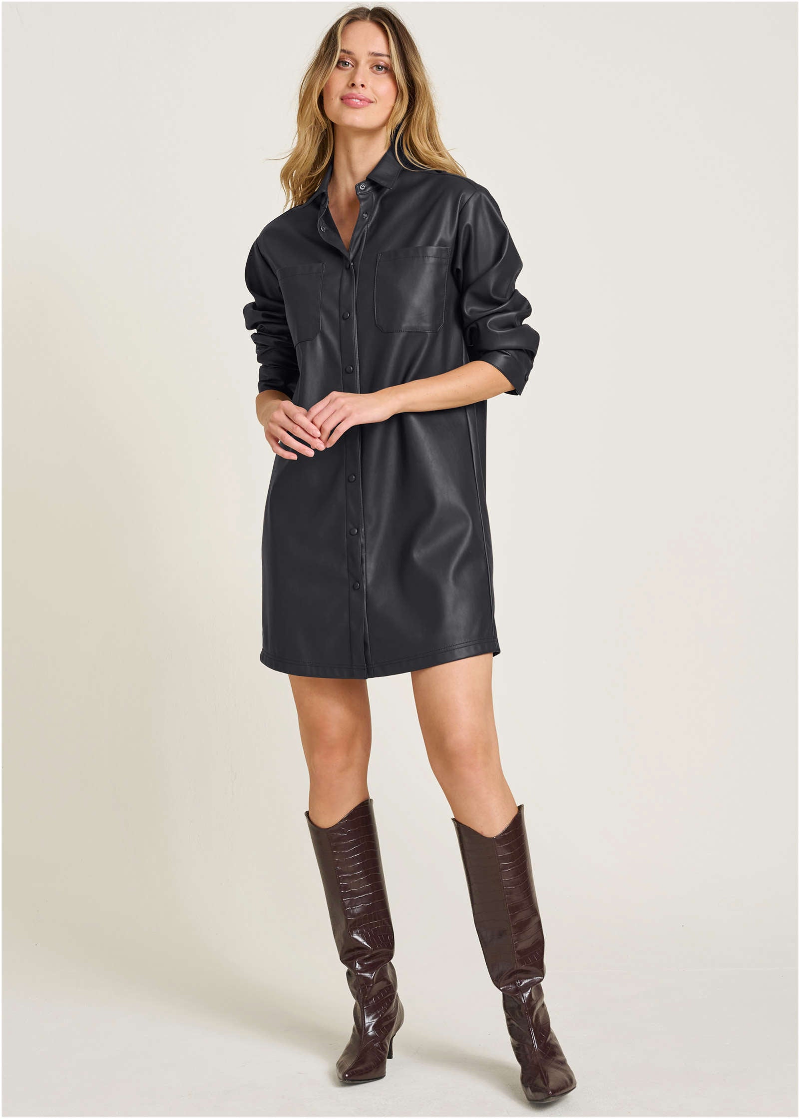 So buttery-soft, you won't believe it's faux! We took the classic shirt dress to edgy new heights in sophisticated faux-leather. Striking the perfect balance between tailored and effortlessly cool, this mini is a match for both the workday and for after-hours plans. The best part: the hint of stretch that makes it super comfy. * Sizes: XS (2), S (4-6), M (8-10), L (12-14), XL (16) * Plus sizes: 1X (18-20), 2X (22-24), 3X (26-28) * Runs large. If between sizes, we recommend sizing down * Mini length, 35" length from shoulder * Long sleeves * Collared neckline * Front snap closure * Patch pockets on chest * Fabric has minimal stretch * Polyurethane. Imported