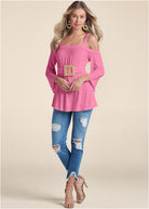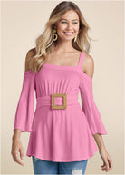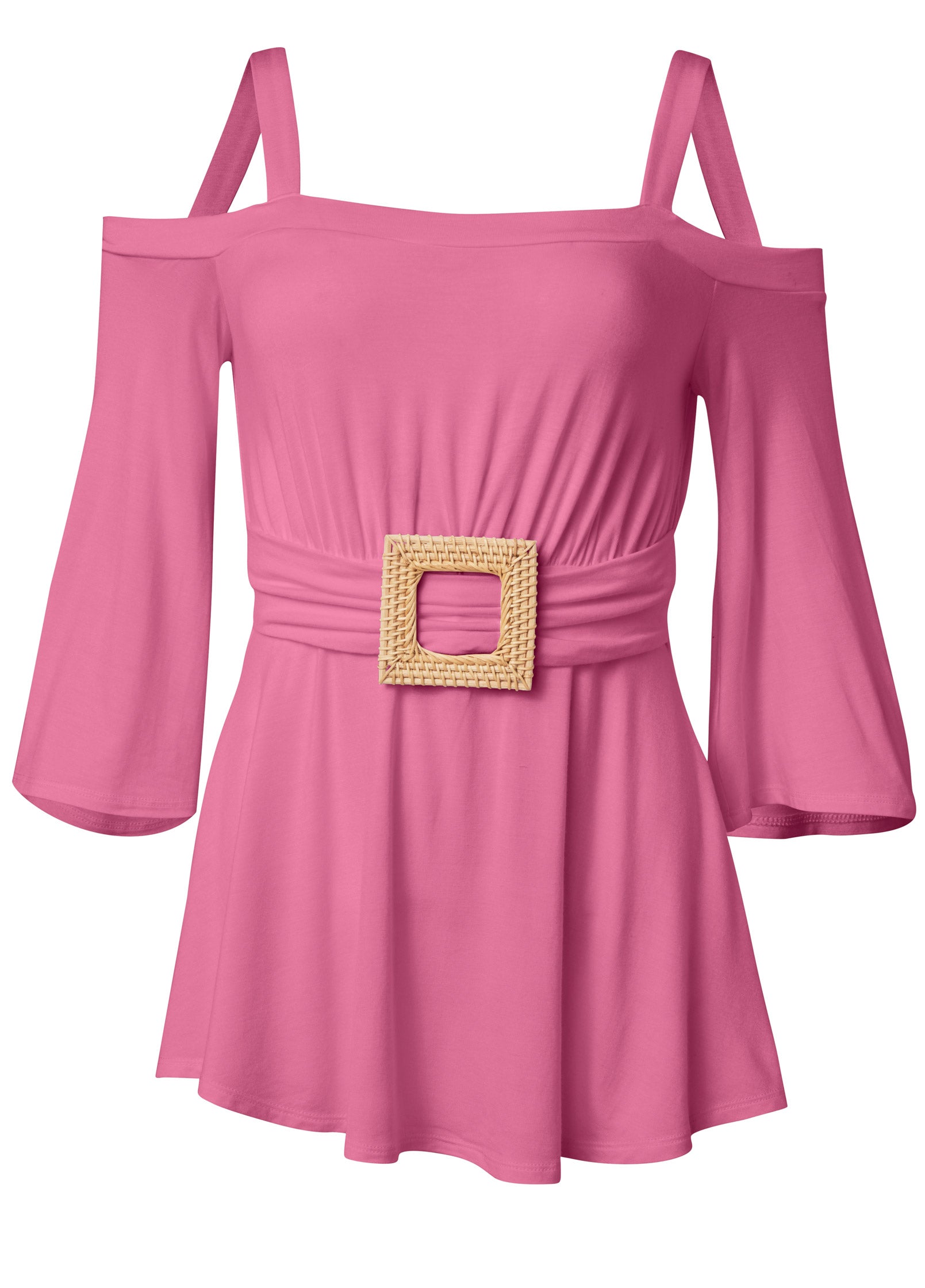With its square raffia belt buckle detail in the front, this cold-shoulder top gets a natural edge! Floaty hemline assures front and rear coverage with 3/4 length bell sleeves that echo the breezy bodice. Fabric loops through the belt buckle and wraps the waist to define the feminine and flirty shape.
