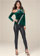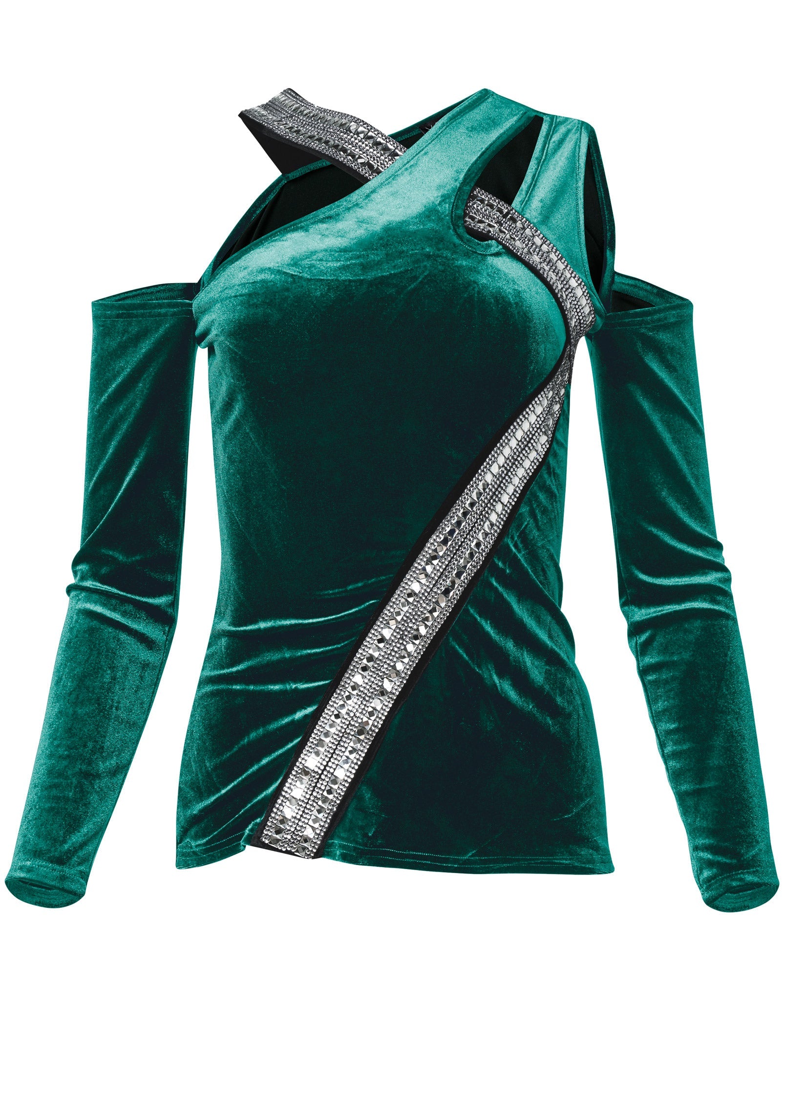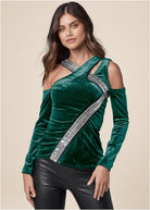 A going-out top that goes above and beyond! Silky smooth to the touch, this long-sleeve velvet top lends a bold edge to any look with its cold-shoulder styling, asymmetrical crisscross cutout neckline and glamorous rhinestone and stud embellished strap accent that curves from neck to hip. * Sizes: XS (2), S (4-6), M (8-10), L (12-14), XL (16) * Plus sizes: 1X (18-20), 2X (22-24), 3X (26-28) * 25" approx. length; varies by size * Fabric has stretch * Poly/spandex. Imported