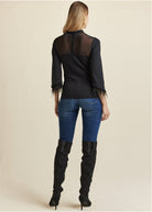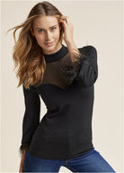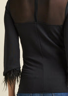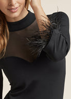 This top is great at dropping hints. The mock neck and three-quarter sleeves read sophisticated, but the sheer mesh panel above the sweetheart neckline and the feathers that trim the sleeves say otherwise. Yeah, we're pretty sure it has a playful side. One thing is clear though: this top is a total conversation starter. * Sizes: S (4-6), M (8-10), L (12-14), XL (16) * Plus sizes: 1X (18-20), 2X (22-24), 3X (26-28) * Center back zipper closure * 24" approx. length; varies by size * Ostrich feather trim is removable * Fabric has stretch * Rayon/nylon/spandex. Imported