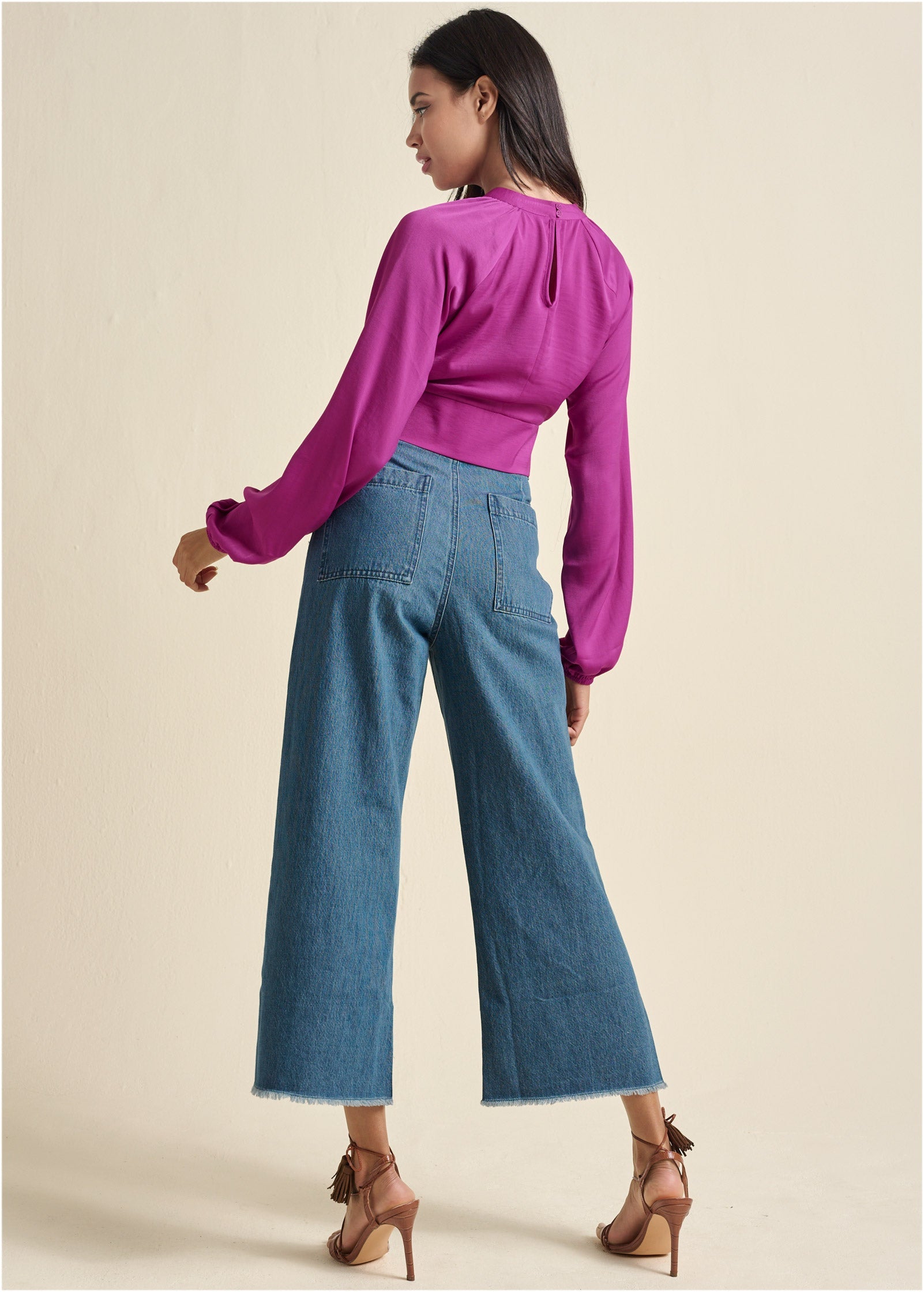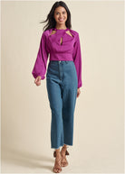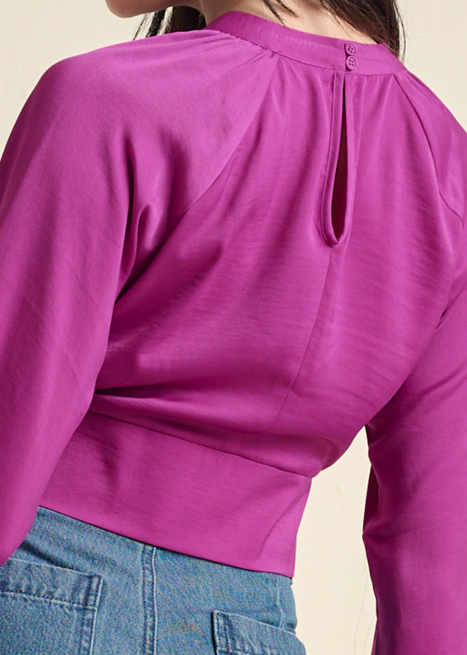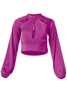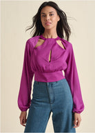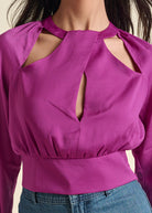 Three revealing front cutouts give this blouse edge, formed by the twist-front mock neck that draws the eye up. A wide, waist-defining band finishes the cropped hem, while the elastic cuffs of the long sleeves create a loose fit to balance the daring bodice that buttons behind the neck.