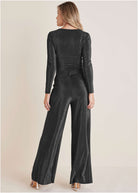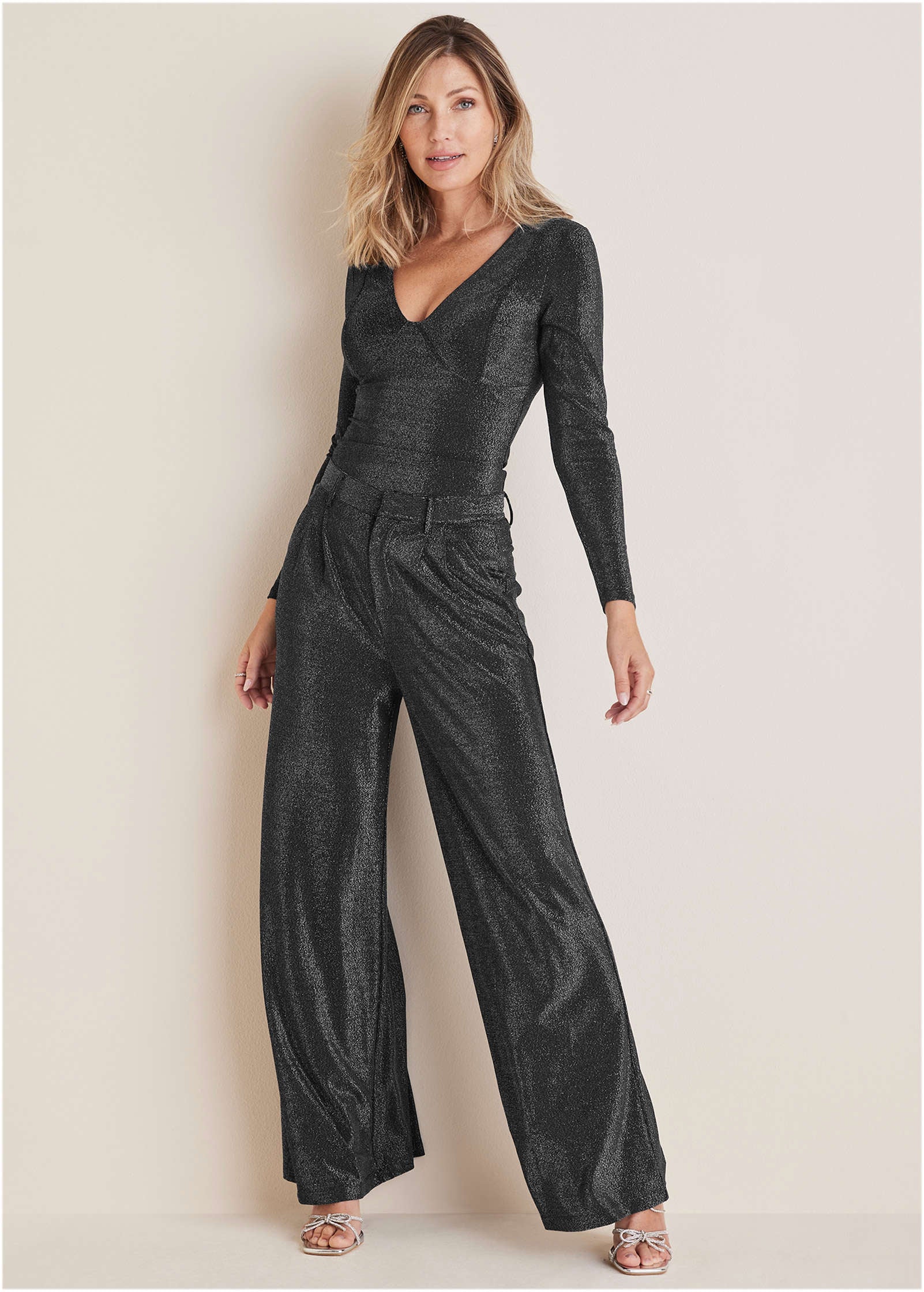 We're certain nobody can dull your sparkle, but this top makes it a given. Done in our stretchy glitter knit fabric, this long sleeve shines from every angle, all while hugging your curves for a comfy fit and sleek look. By day, it lends a fancy and festive touch to denim (tip: add metallic extras to play up the shimmer). For night, dial it up with our matching Glitter Knit Wide Leg Pants for head-to-toe glam.