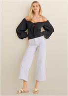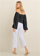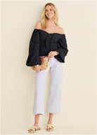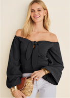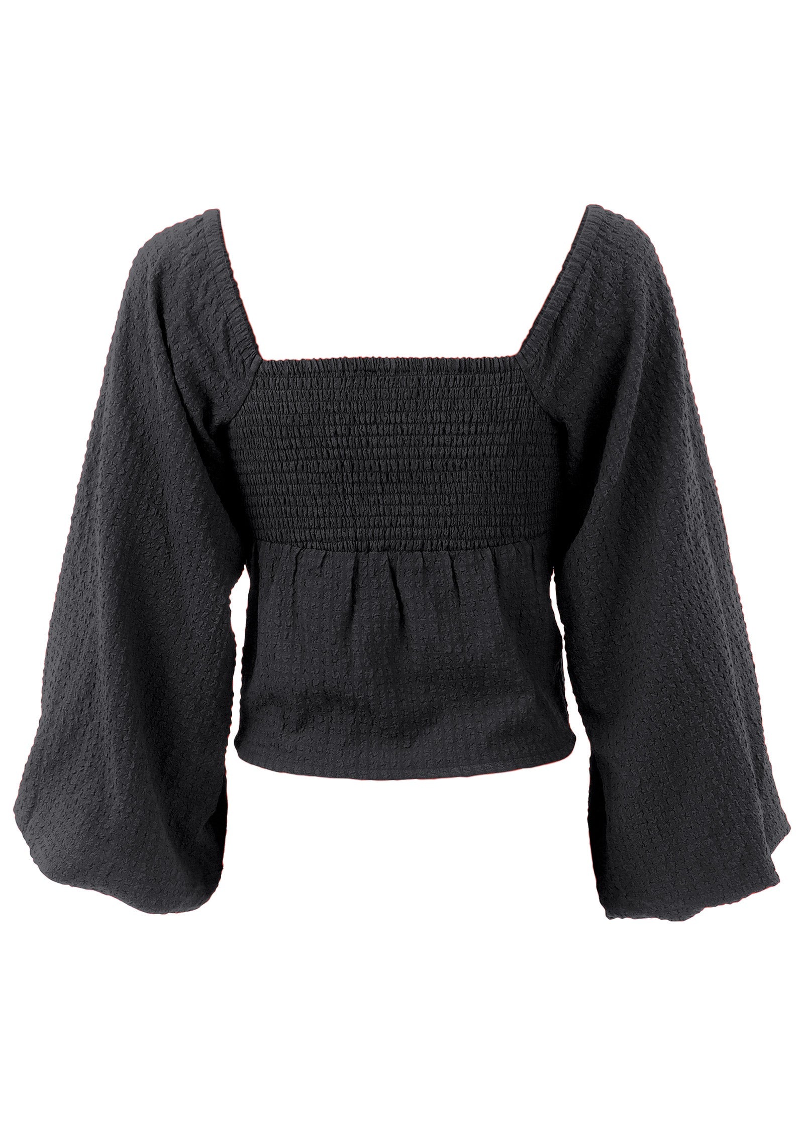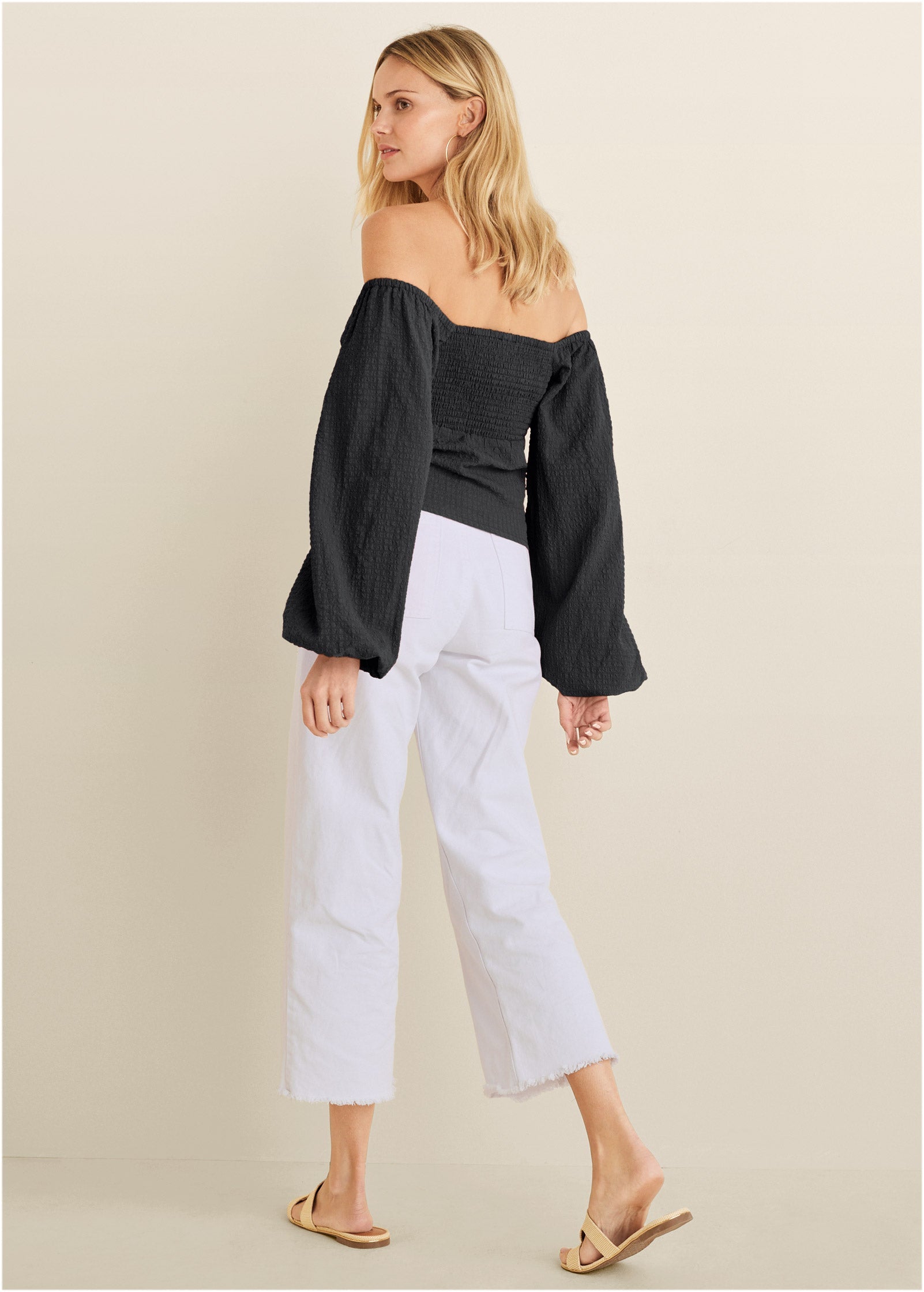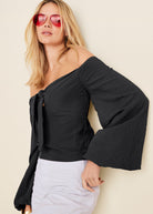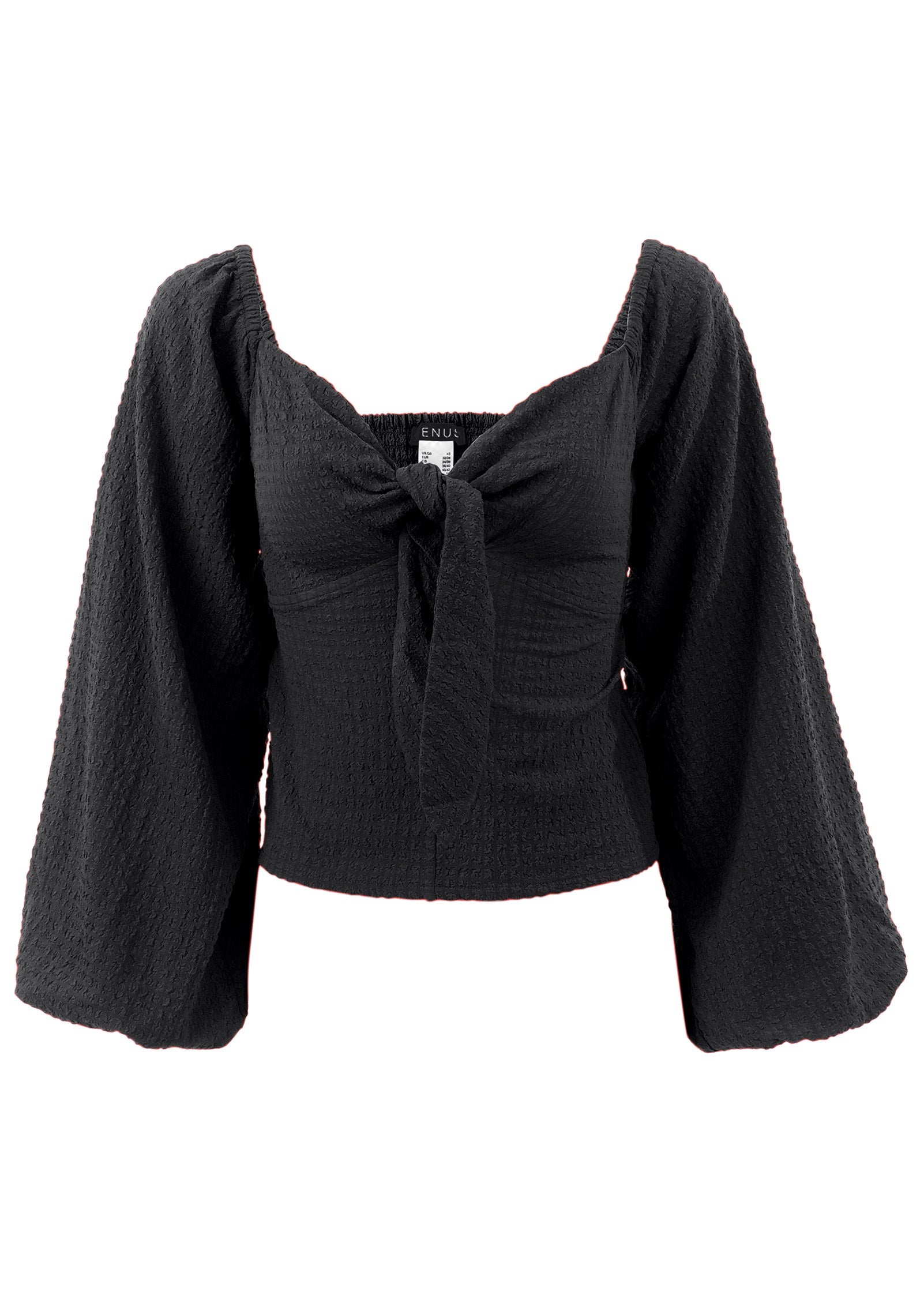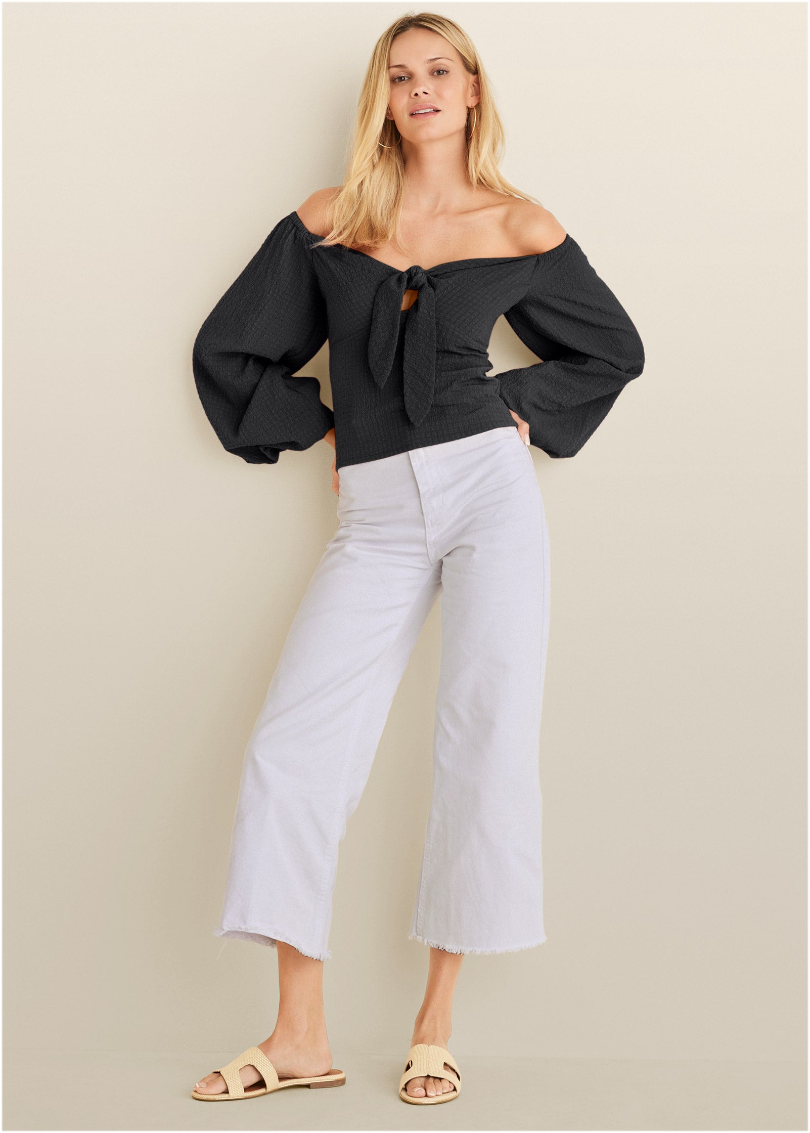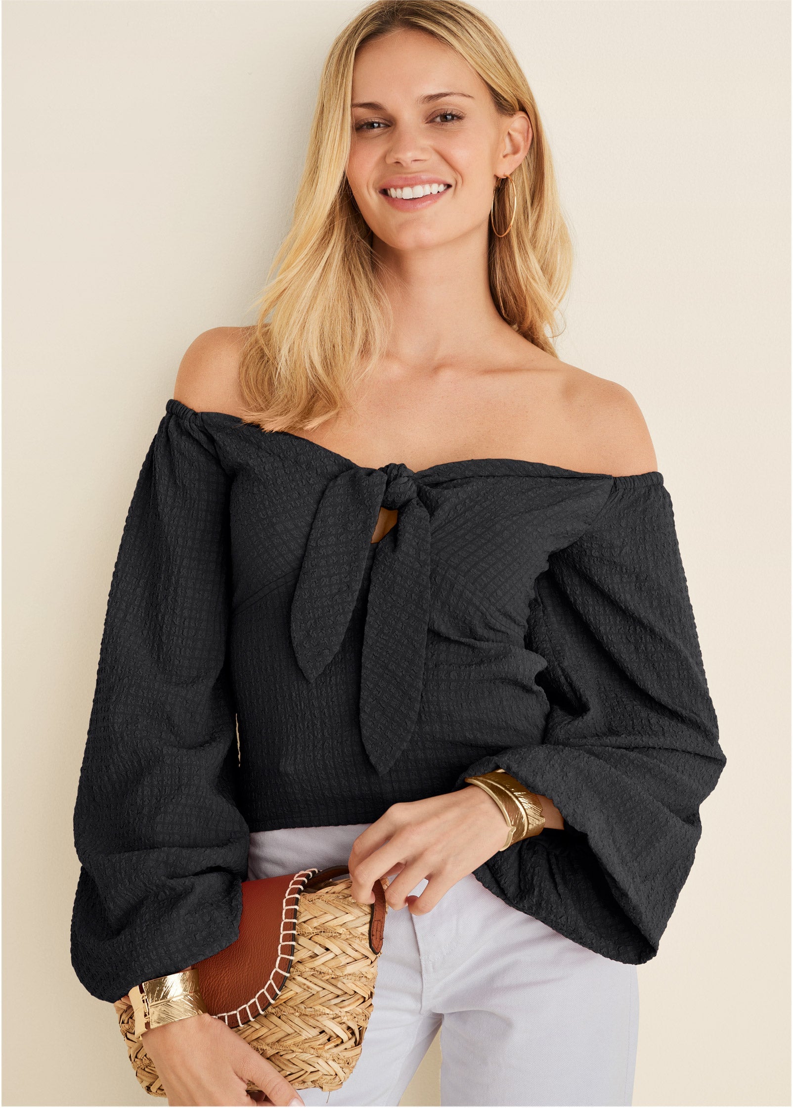 It's hard to pinpoint exactly what makes this top so special because every little detail is worth noting. There's the textured fabric that catches the eye, voluminous balloon sleeves that make a statement and a tie detail at the front that adds a playful touch. Plus, you can wear the sleeves on your shoulders or pull them down for an off-the-shoulder moment.