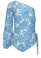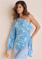 Turn heads with this printed one-shoulder top that combines playful details with effortless style. The balloon sleeve adds a touch of drama, while the ruched detail and side tie enhance the flattering fit. With its asymmetrical hem, this top offers a dynamic, elevated look. Whether you’re heading to a coastal escape or a laid-back lunch, this piece is your perfect partner in chic.
