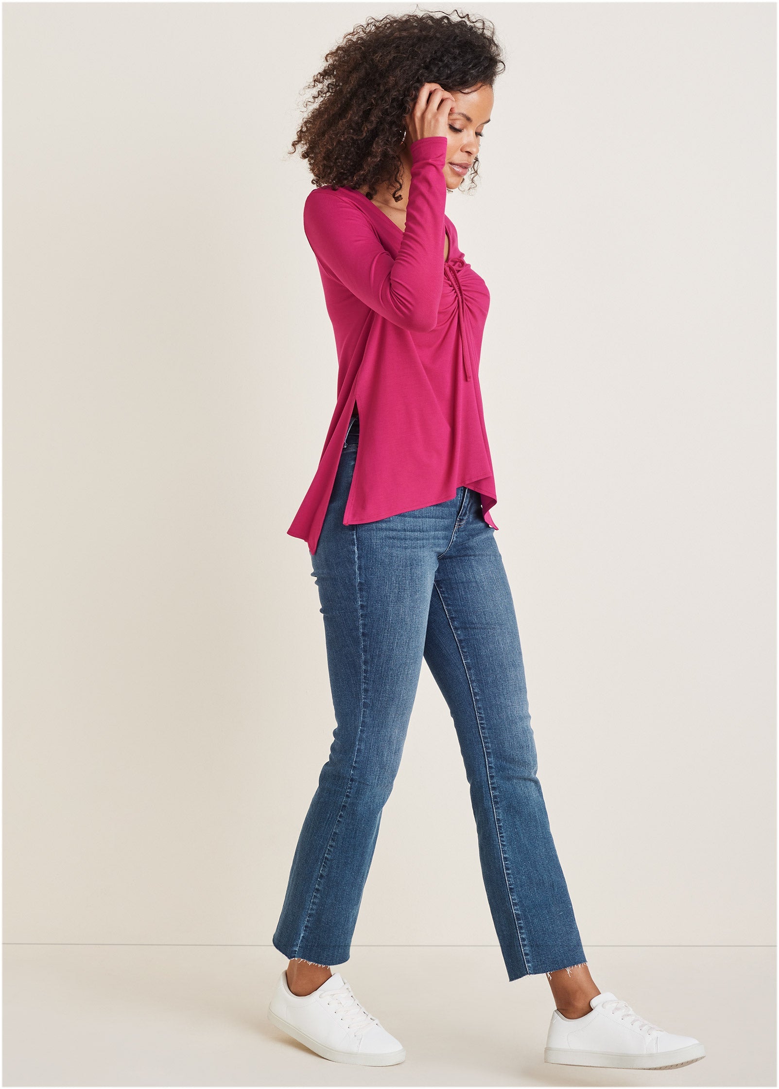 Long-sleeved tops are a closet essential. Trendy long-sleeved shirt blouses are great for spring, summer, fall, and winter. Switch up your look with new layers and accessories. Try a boho look with flowing long-sleeve tops or tie-dye blouses. Other essential details include waist ties, smocked waist, ruching, and more.