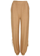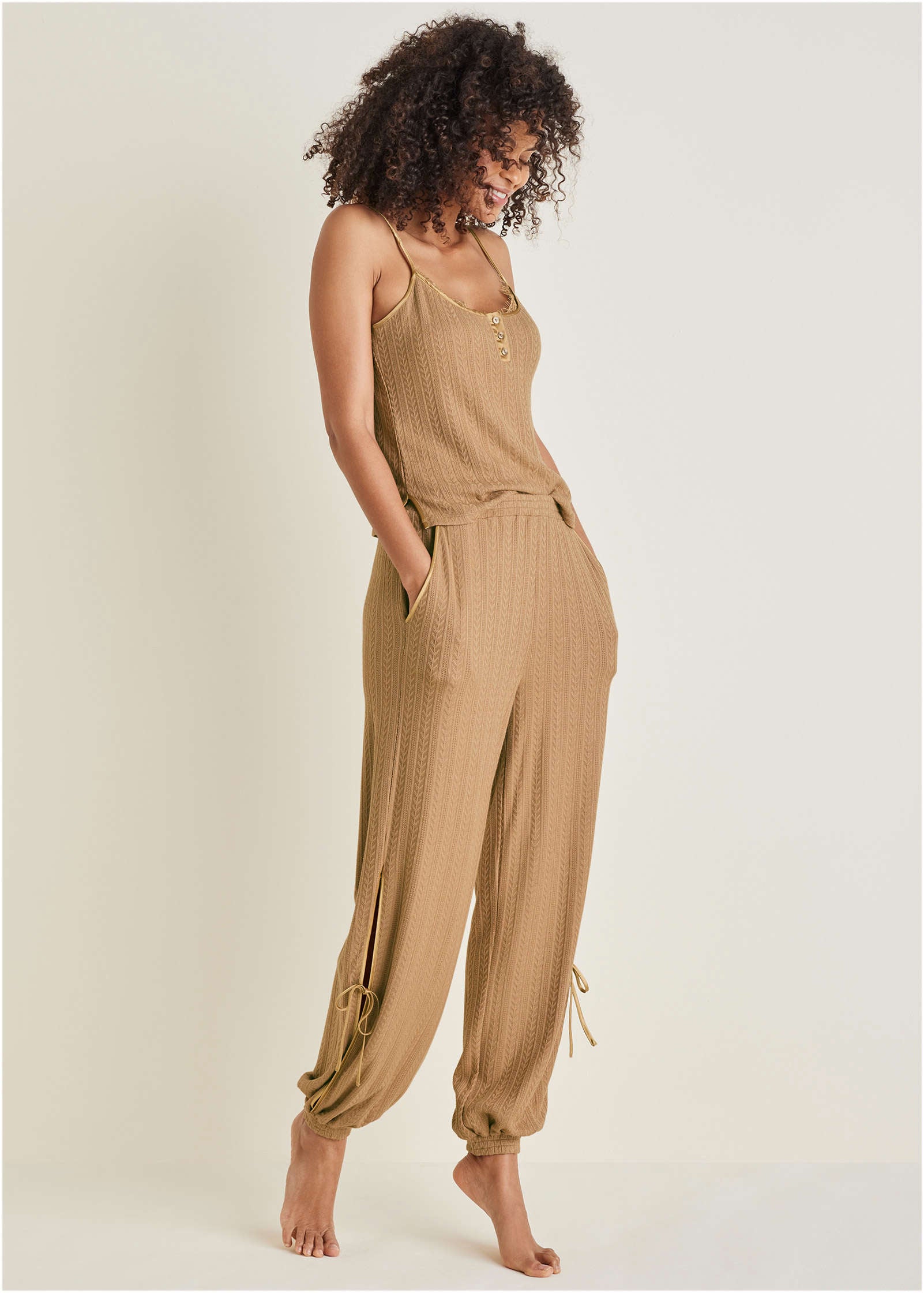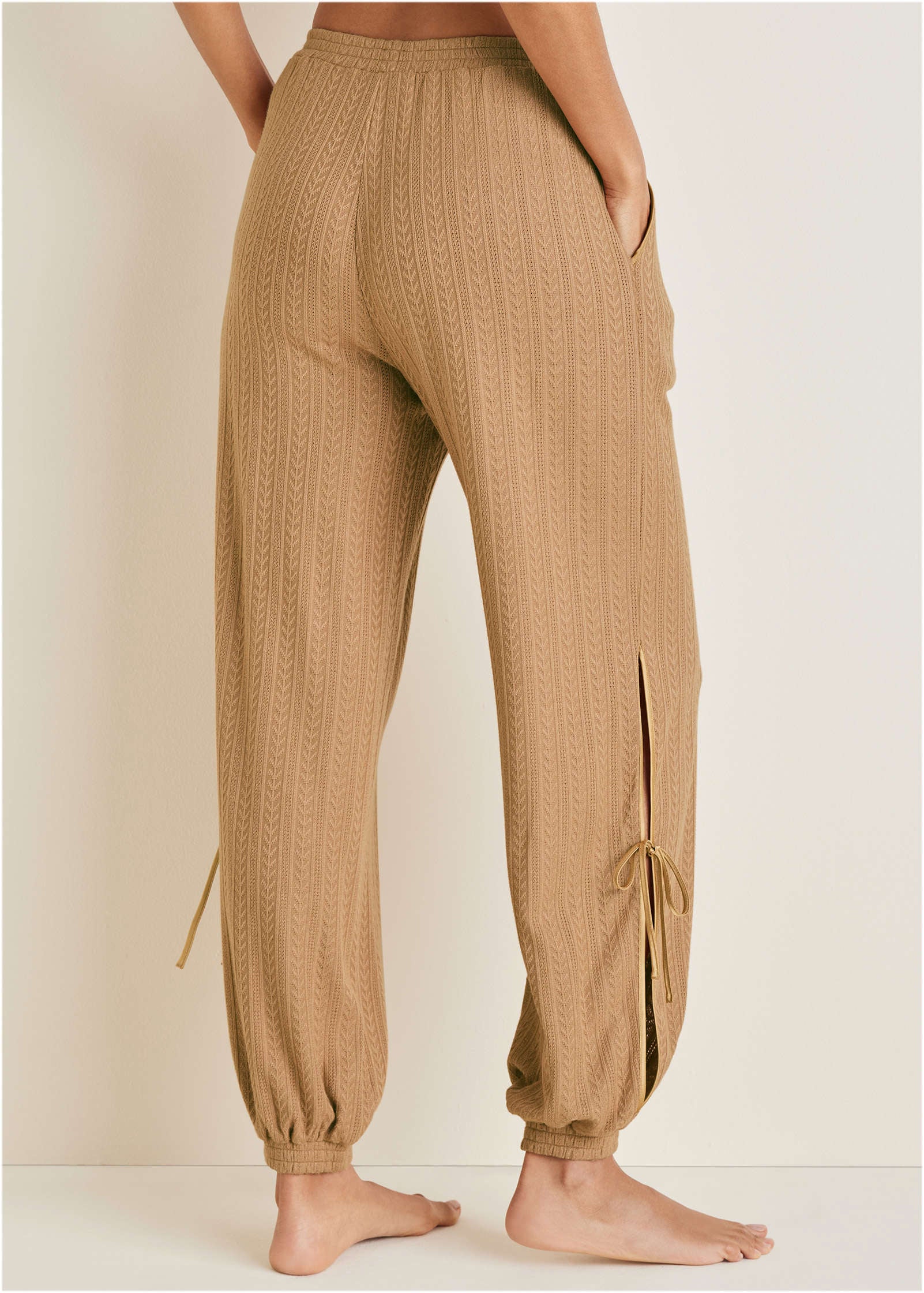 Get the hotel feel right at home with these lightweight joggers that make every day feel like checking in for a five-star stay—the only thing missing is room service! Delicately-textured fabric along with breezy side slits affixed with feminine bow ties give these easy-chic lounge pants an elevated look. What are you waiting for? Book your stay now.