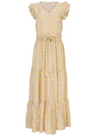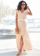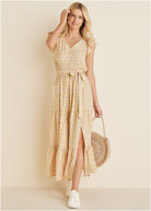 Sunny days call for sunny dresses. This maxi is easy and breezy from the flutter sleeves to the twirly tiered skirt. Cinch the waist with the included tie belt (or your own statement piece) and slip on sandals for a warm-weather uniform.