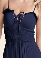 Maxi season is our favorite season! Kick it off with this casually cute piece featuring a flattering smocked waist that hugs your curves. The lace-up neckline loops through metallic grommets for a subtle hint of glam, while a ruffled edge keeps it flirty for beachside brunches or backyard parties.