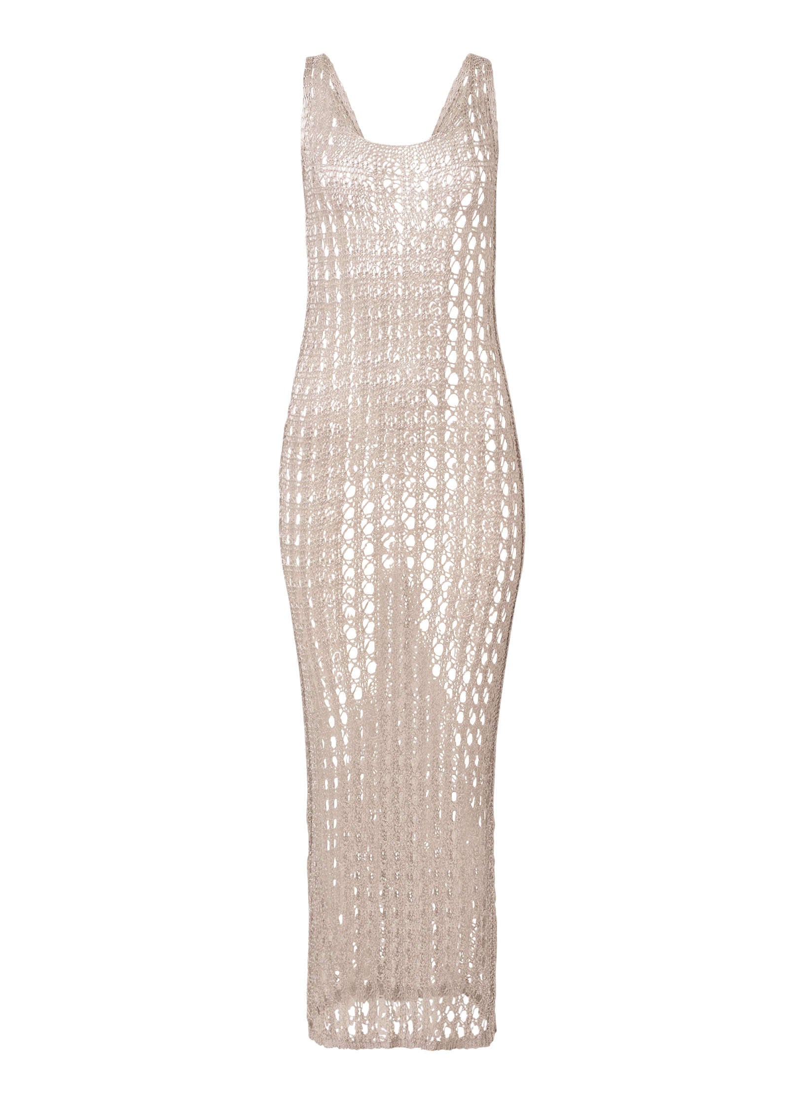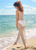 If you're going for a destination look that's a little more elevated, this shimmer-infused cover-up delivers the shine! Metallic threading defines the loose crochet coverage, spanning from scoop neck to hem of this maxi dress cover-up. Let your favorite suit show through beneath the sheer design.