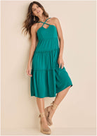 This Keyhole Midi Dress is the perfect mix of elegance and ease. The halter neckline and keyhole detail add a sultry touch, while the tiered skirt brings movement and breezy charm. Designed with fully adjustable straps, it ensures a customizable fit that flatters every shape. Whether you're heading to a romantic dinner or taking in the sunset barefoot on the beach, this dress is a must-pack for your next vacation.
