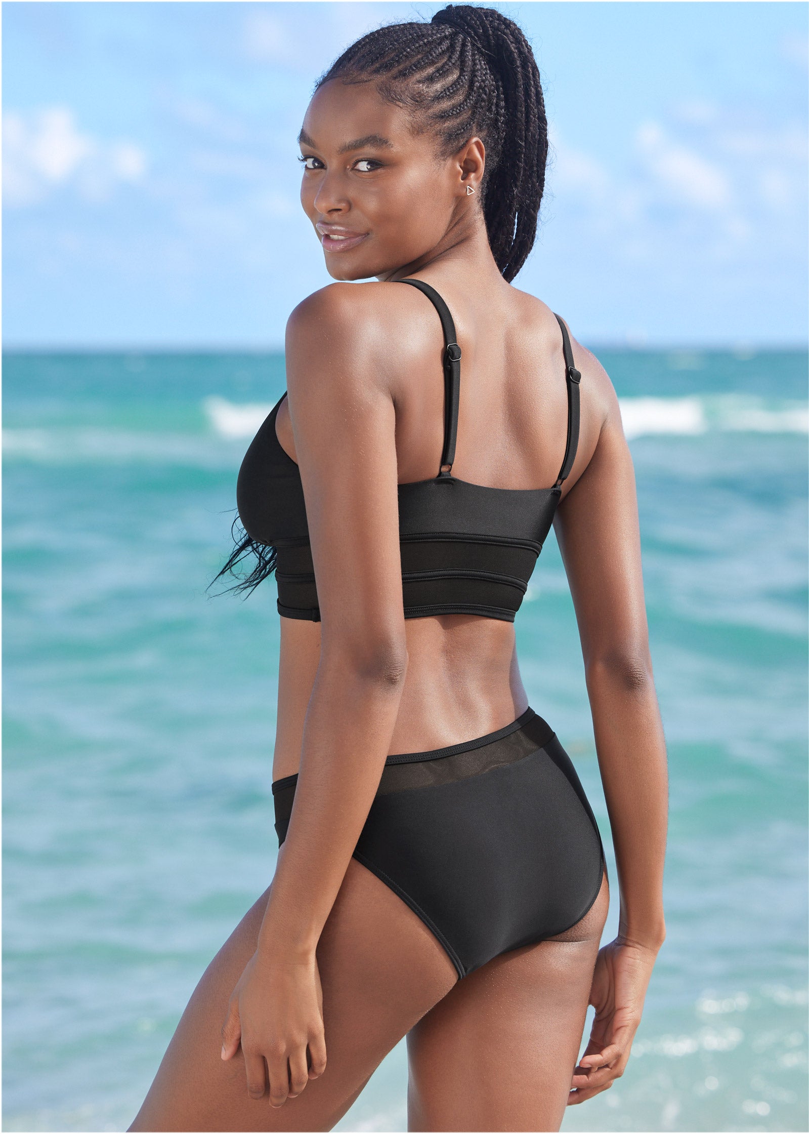 Meet a swim staple with chic appeal! A sheer mesh waistband wraps the hips of this low-rise bottom for a sexy peek-a-boo detail. Offering the coverage you need but with the allure of a moderate rear, this pretty pair goes with you to all your sunny-day activities.