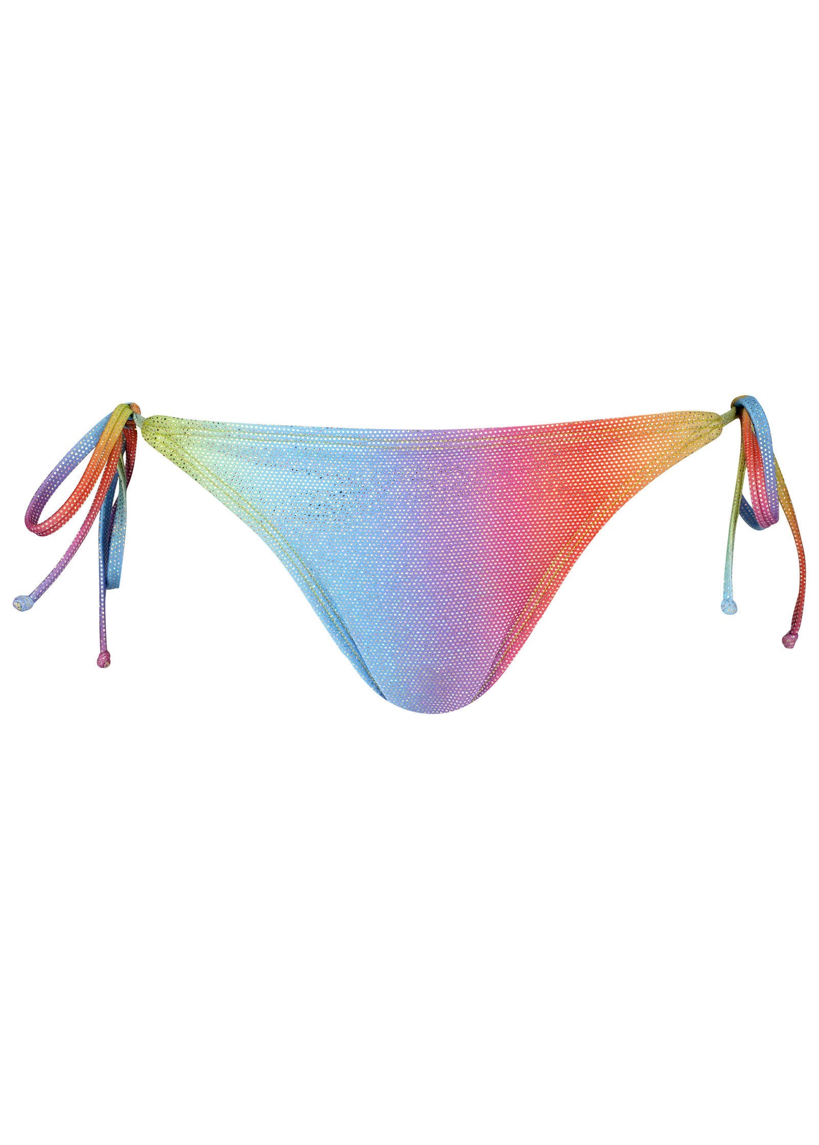 Turn on your rainbow brights in this vibrant bikini bottom that was made for chasing the sun. We took our classic tie-side cut and gave it a metallic rainbow upgrade that shimmers from every angle. From the beach to the pool, this bottom demands to be noticed. * Sizes: XS (2), S (4-6), M (8-10), L (12-14), XL (16) * Low rise * Adjustable tie sides * Moderate coverage * Imported of poly/spandex tricot