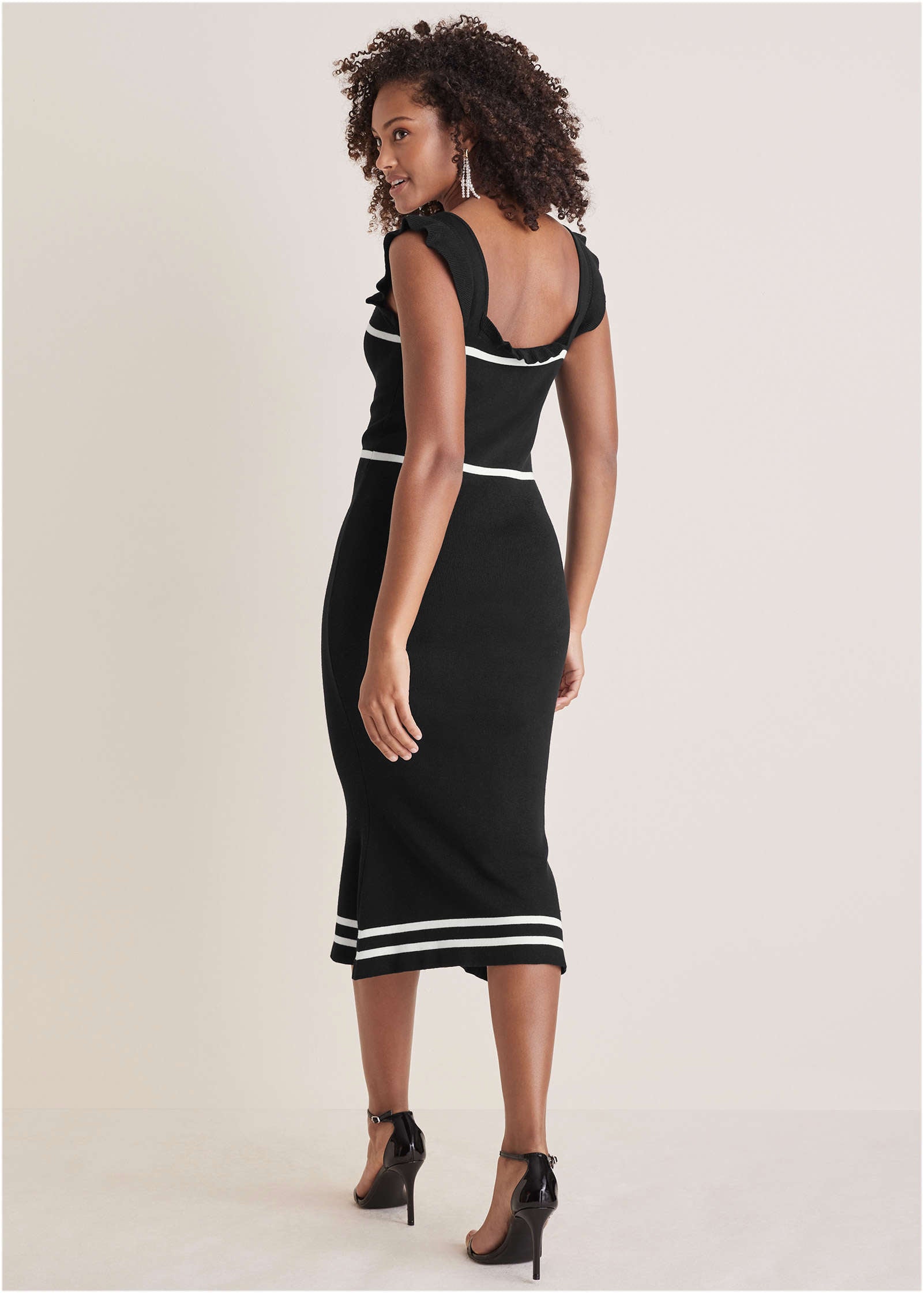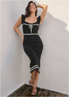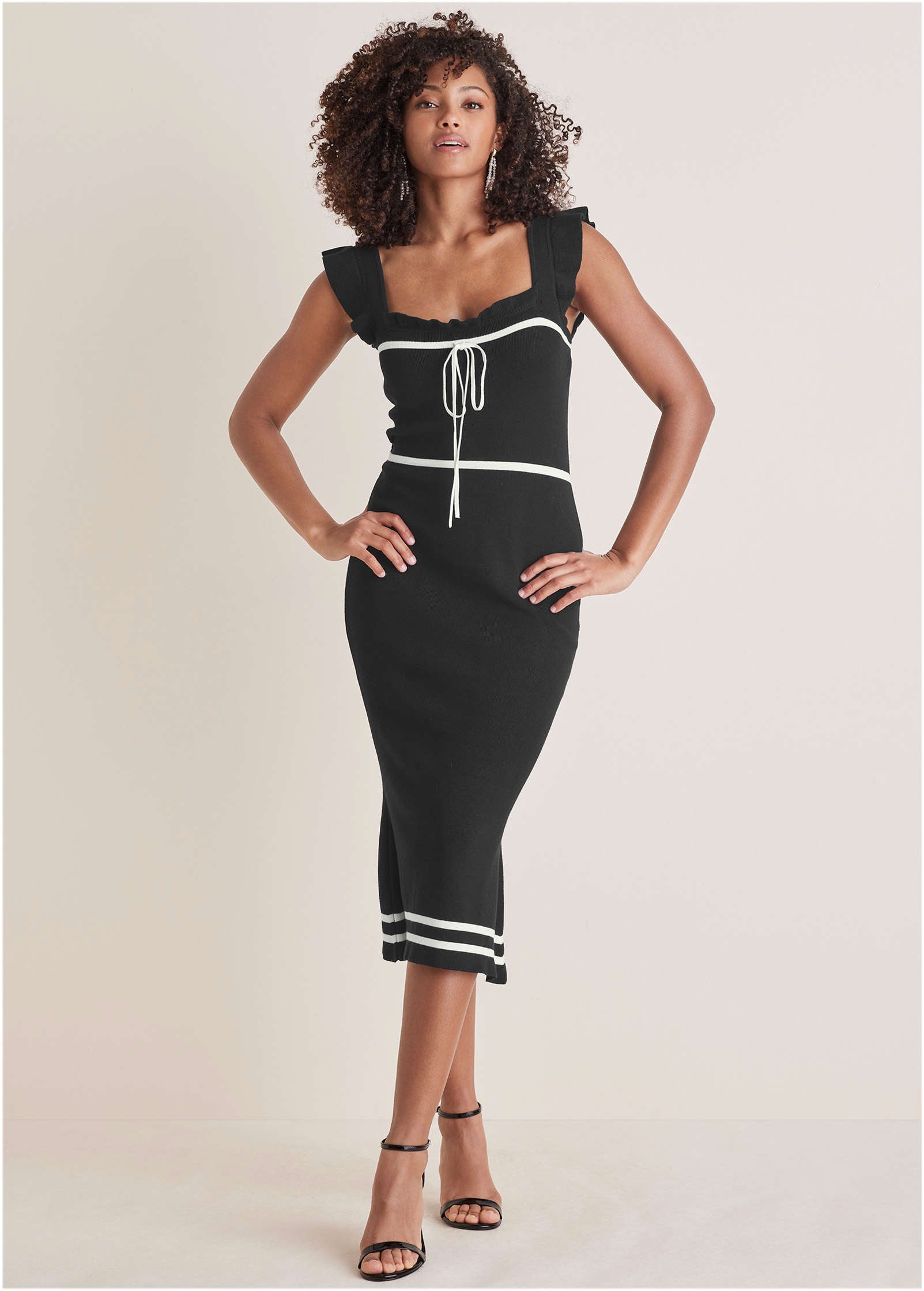 Opposites attract -- and this contrasting ruffle midi is proof. The sleek-yet-stretchy silhouette hugs every curve, while the contrasting details highlight your shape. Piping along the bust, waist and hem accentuates your figure and draws the eye down. Add matching heels to take the monochrome look to a new level or add even more contrast with a bold jacket. * Sizes: XS (2), S (4-6), M (8-10), L (12-14), XL (16) * Plus sizes: 1X (18-20), 2X (22-24), 3X (26-28) * Available in petite sizes * Available in plus sizes * Sleeveless * Tie front detail * Fabric has stretch * Viscose/nylon. Imported