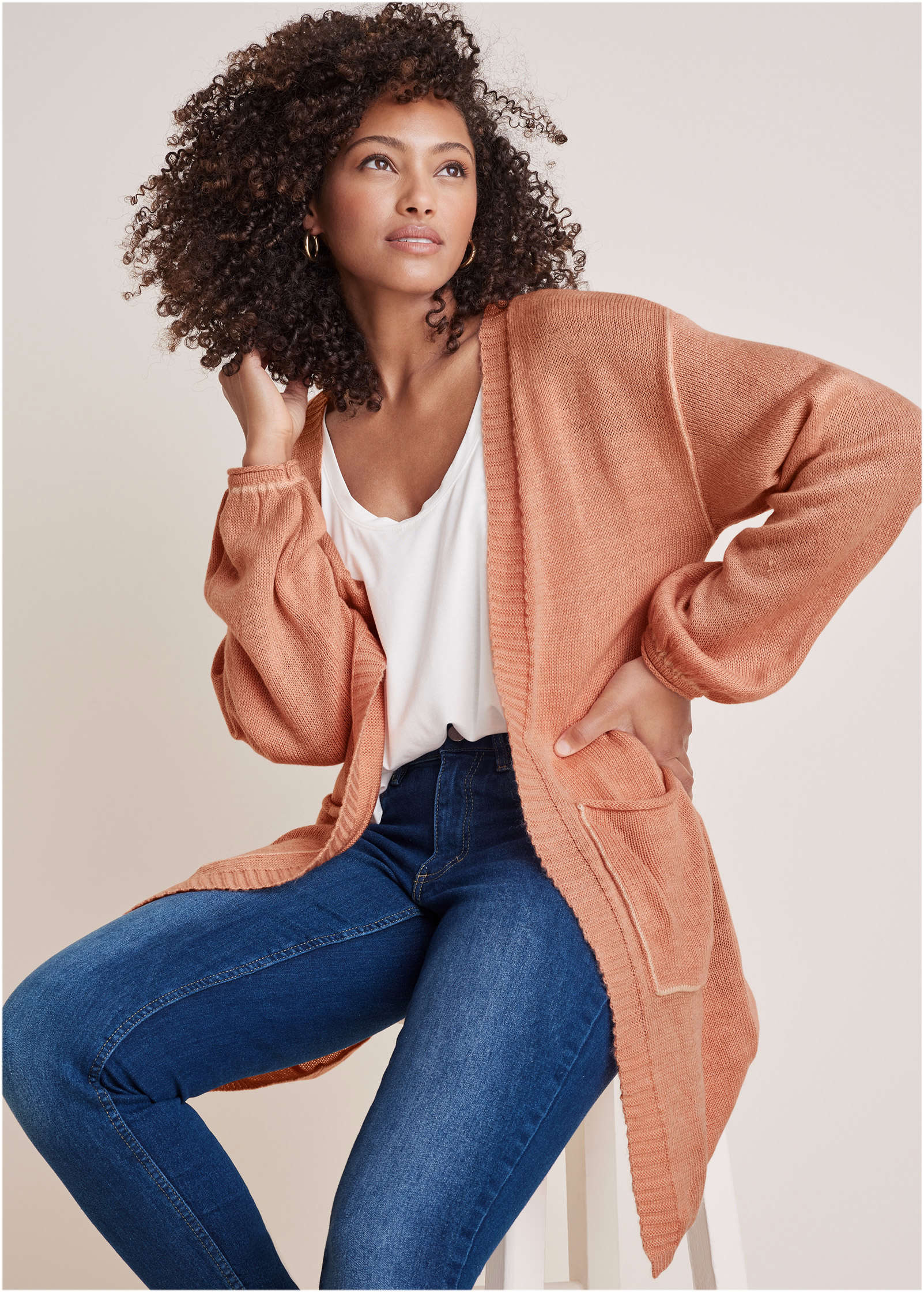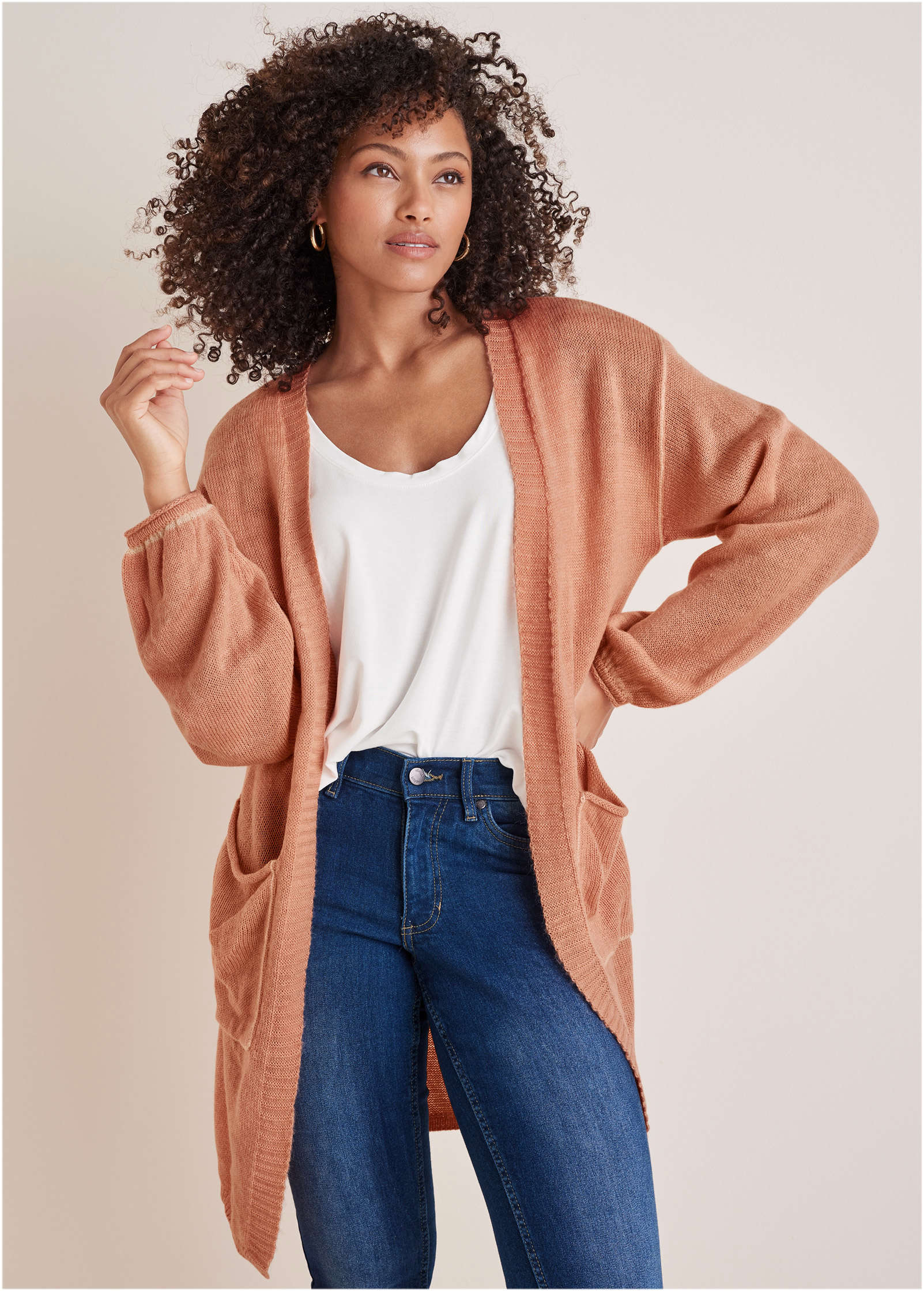 This Contrast Stitch Cardigan is about to become your new favorite sweater. With an open front, long loose sleeves for easy layering, and handy front pockets, it’s comfy, casual, and so easy to style. The bold contrast detail adds just the right touch of interest. Throw it over jeans and a tank for a casual day out, or pair it with leggings for a cozy night in—this cardigan is the ultimate wear-anywhere layer. * Sizes: XS (2), S (4-6), M (8-10), L (12-14), XL (16) * Open front: Effortless to wear * Long sleeves: Cozy and comfortable * Loose sleeves: Perfect for layering * Front pockets: Practical and cute * Contrast detail: Adds standout style * Acrylic. Imported