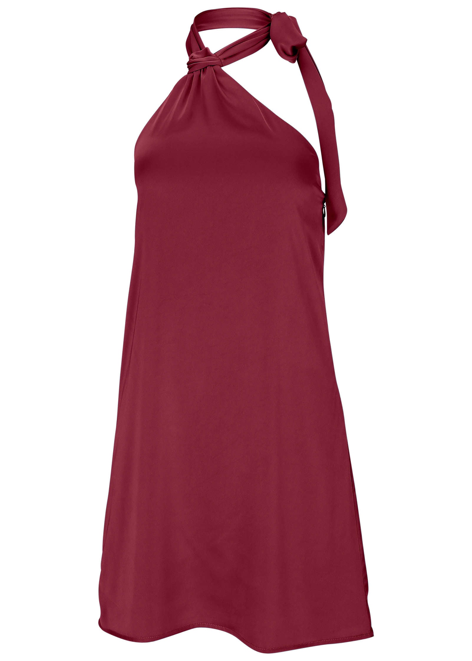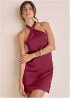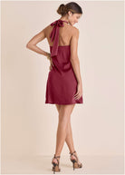 A little glam, a lot of wow, all wrapped up in the perfect little dress. This stretch mini turns heads with a sleek halter neckline and draped sash tie that adds instant elegance. The body-skimming fit keeps things sultry, while the stretch fabric moves with you—so you can own the dance floor all night long. Cocktail hour, wedding reception, or any RSVP, this dress always makes the guest list.