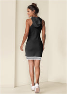 Carefree with some attitude, this hooded lounge dress stays casual with sneakers, but is perfect for rocking with embellished flip flops or sandals when you're looking for extra oomph. The bottom edge crisscrosses in front and boasts a sleek layered band with color block striping that keeps it trendy.