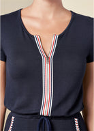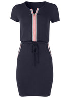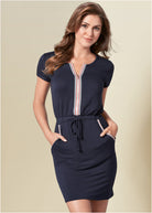 Giving a nod to the nautical trend, this zip-front lounge dress has everything you need to look and feel great. The tie waist helps taper this cute silhouette and the coordinated trim on the front pockets adds a curve to your hips! Zip the front to your liking and kick back.