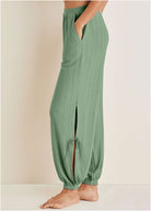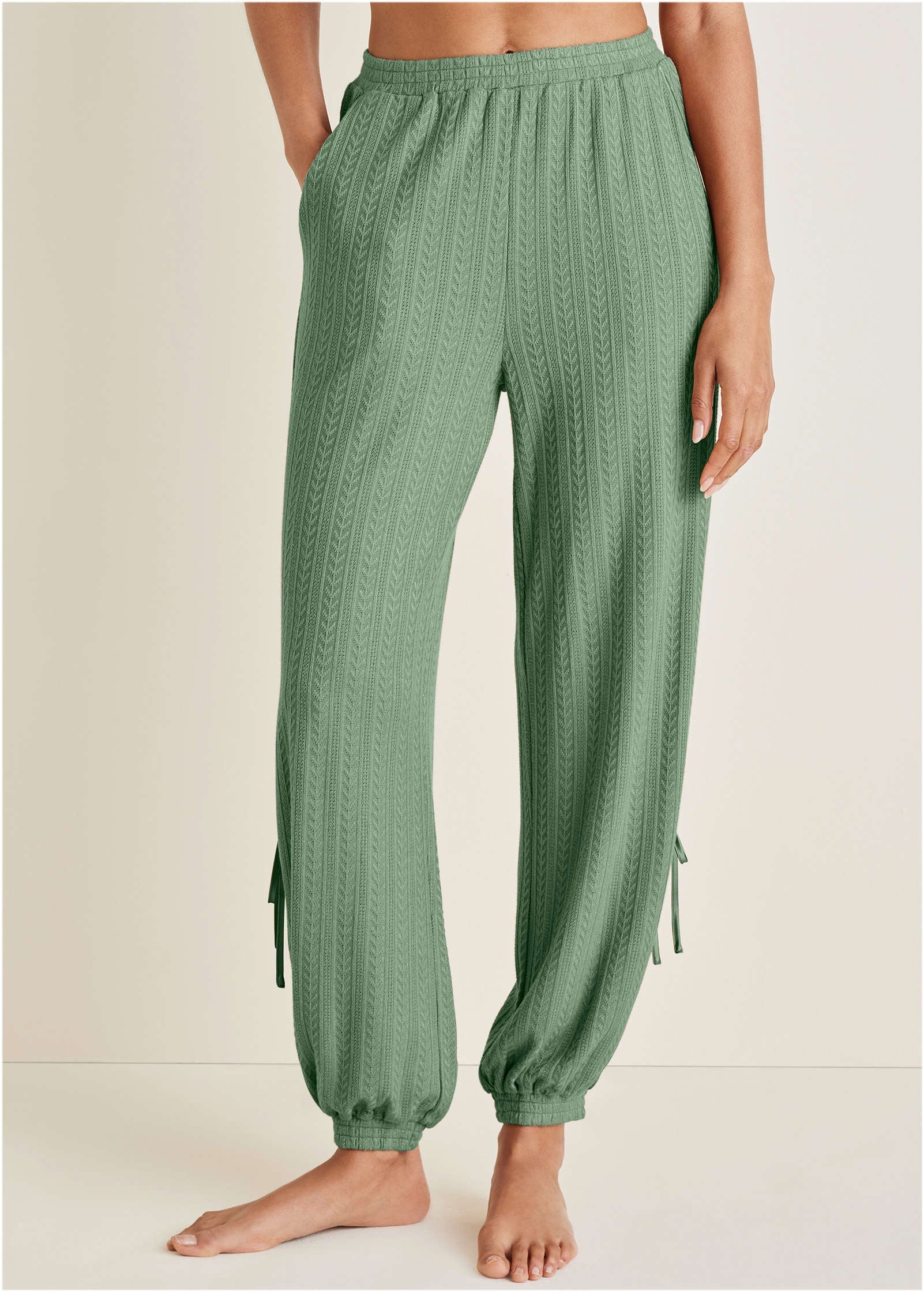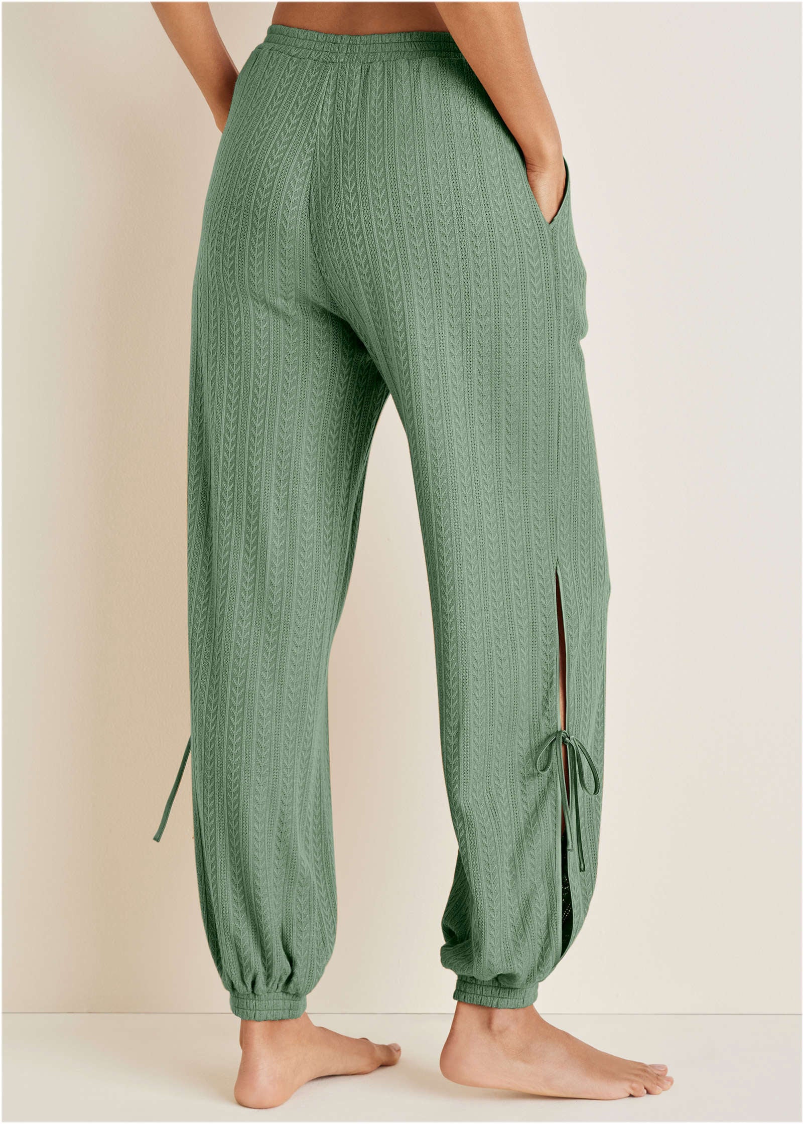 Get the hotel feel right at home with these lightweight joggers that make every day feel like checking in for a five-star stay—the only thing missing is room service! Delicately-textured fabric along with breezy side slits affixed with feminine bow ties give these easy-chic lounge pants an elevated look. What are you waiting for? Book your stay now. * Sizes: XS (2), S (4-6), M (8-10), L (12-14), XL (16) * Mid rise * Elastic waistband * Pockets * Side slits * Bow ties at sides * Rayon/polyester/nylon/spandex. Imported