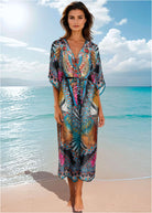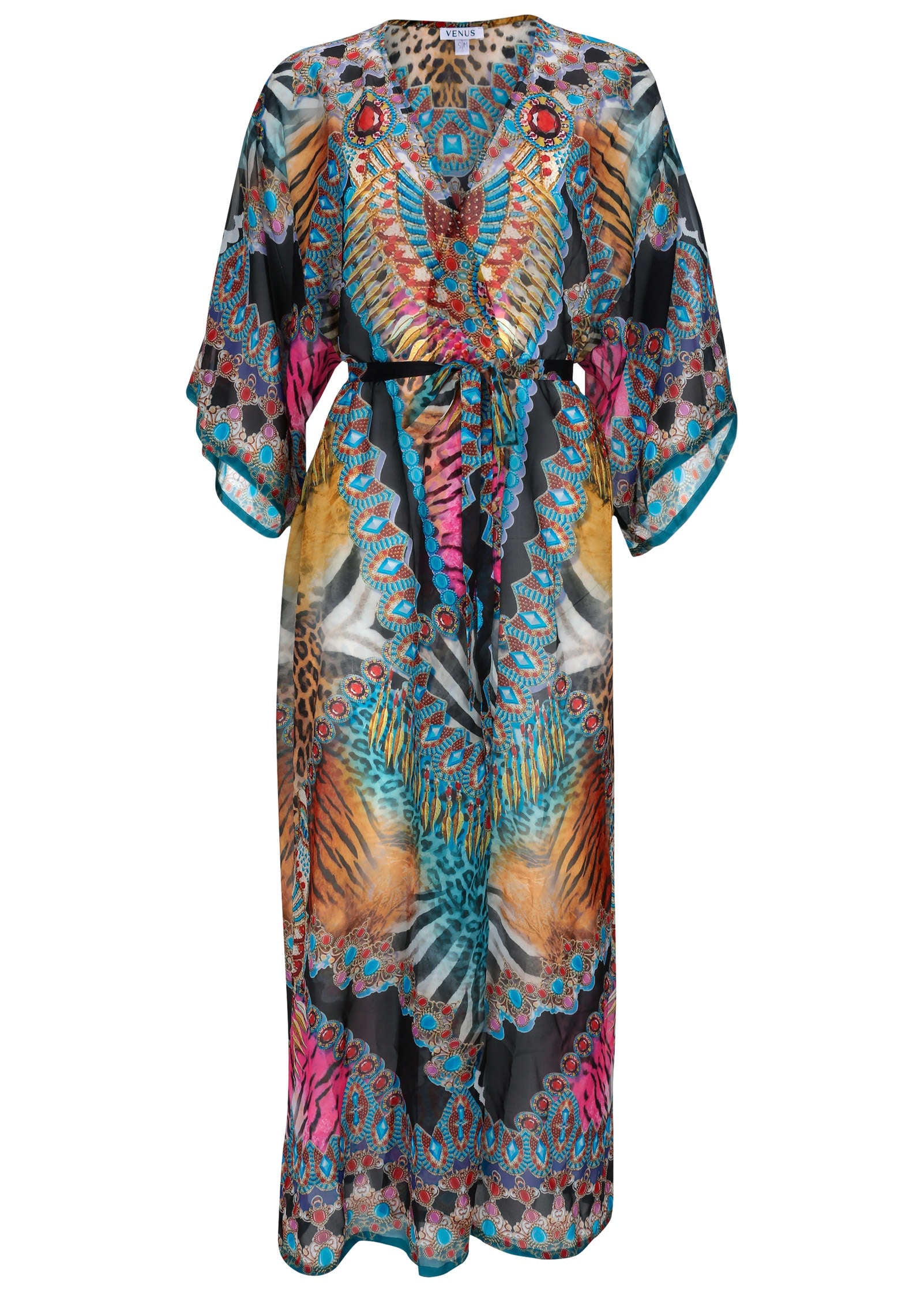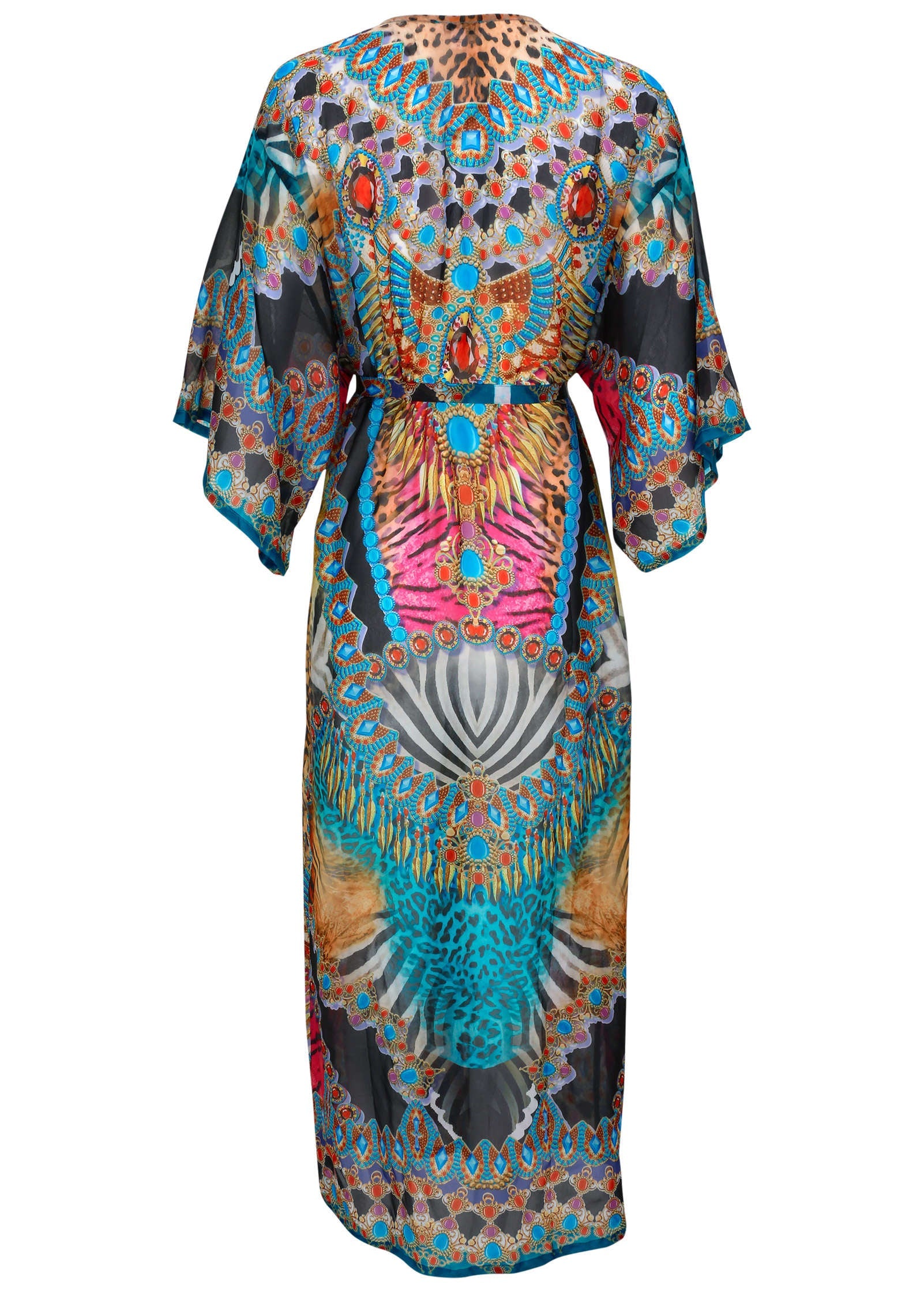 Own the beach in this ethereal kimono cover-up. It's lightweight and just sheer enough to show off your suit underneath, even when belted. The bold mixed print and vibrant palette are the perfect complement to a bright suit and add a fun color pop to a classic black or white swim look.