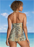 This flirty tankini boasts a sheer, floaty bodice with a draping sash down the front for extra breeziness. Bustline ruching adds fullness to this style that lets you keep the halter strap attached for added support or opt for a strapless look to embrace your sexy side.