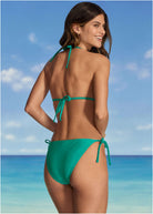 Striking the perfect balance between moderate and cheeky rear coverage, these string bikini bottoms assure your ideal fit thanks to the adjustable ties at the sides. This hip-baring bottom finishes with metallic beads on the string sides, hinting at glam and pairing effortlessly with any swim top.