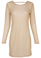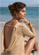 Serving drama from the front and the back. This sheer, body-hugging cover-up brings the heat with a draped open back and curve-skimming stretch fabric. Long sleeves add a hint of balance to the sultry silhouette, making it a total head-turner. Wear it over your favorite suit and let your swimsuit—and your confidence—do the talking.