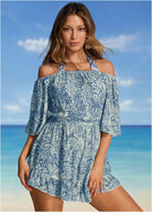 Beach day or date on the boardwalk? Either way, you're covered in this flirty romper. Show off your sun-kissed glow with an off-the-shoulder neckline and short, flowy shorts. Slide it on over your favorite VENUS swimsuit for daytime or add your favorite flats for a versatile look.