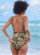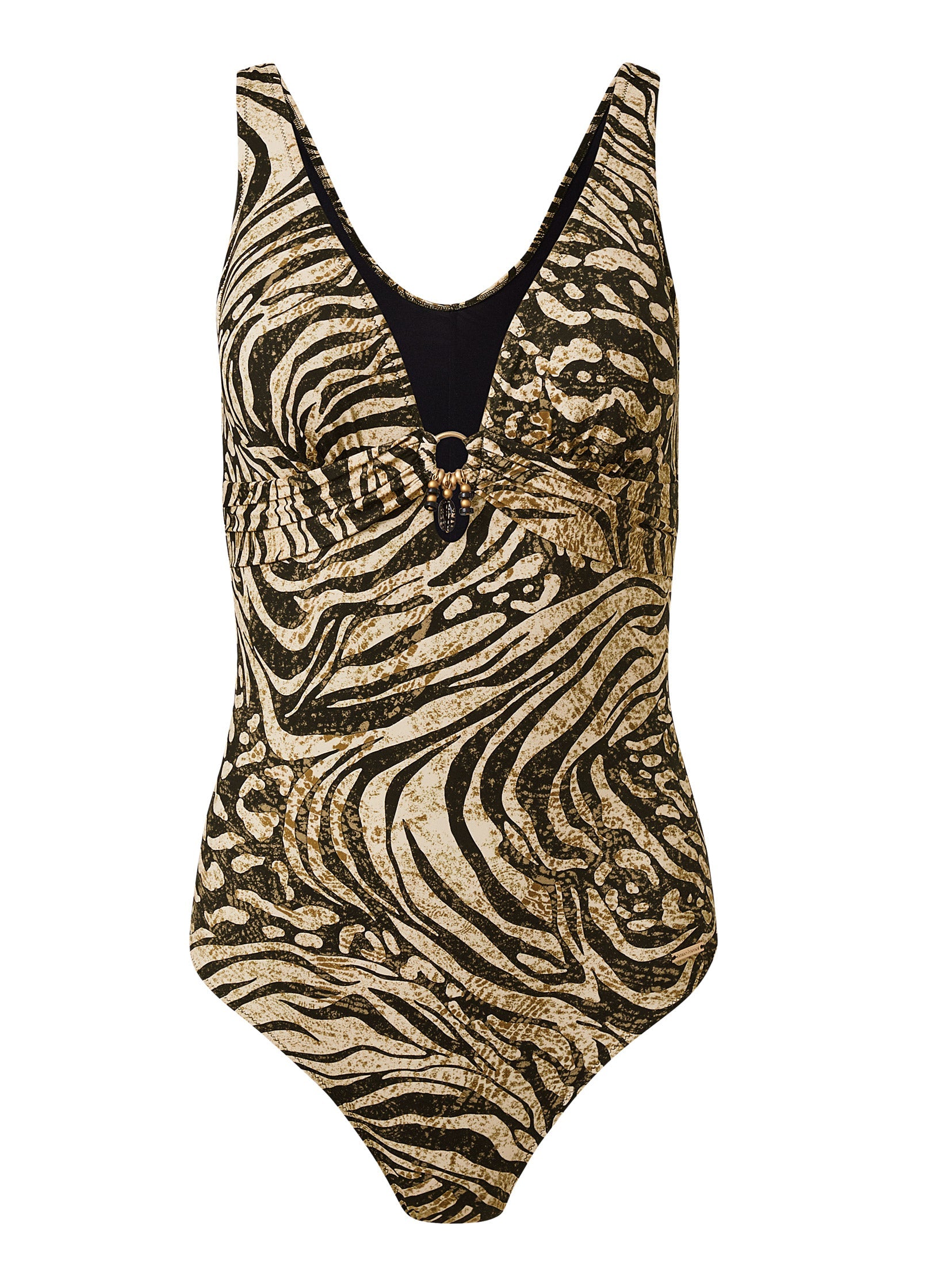"Day at the beach" has a nice ring to it! Get set for your next getaway in this one-piece with plunging neckline and low open back that speaks to your inner goddess. The ring at the front with dangling beads brings a luxe touch, connecting the center with flattering underbust trim for a more confident you.