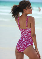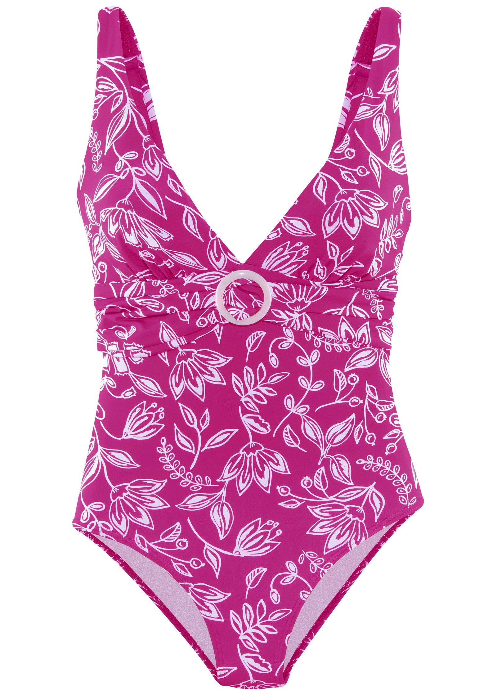 Go bold on the beach in this printed one-piece. A V-Neckline gives this suit the look of a triangle bikini up top, while a ring detail and ruched band below the bust add eye-catching detail. With moderate coverage, this one-piece makes a flattering and sophisticated statement.