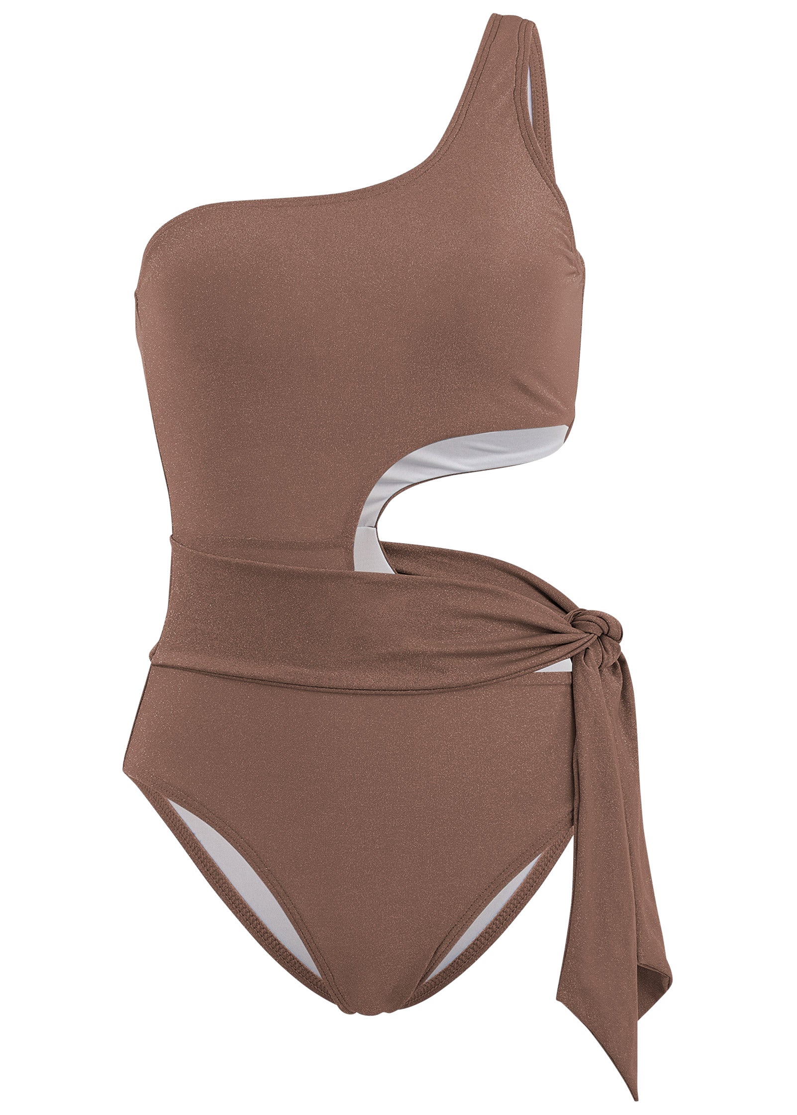 You'll be the picture of poolside perfection in this shimmering one-shoulder one-piece. Radiant metallic threads woven throughout the fabric glisten in the sun. Between the shine factor, the bold side cutout and flattering waist-defining tie, this suit is getaway-glam at its best.