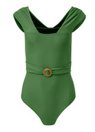 Accentuate your shape when you step out to sunbathe in this one-piece! Wide shoulder straps are accented with gathers, balancing out the sleek silhouette that's made more flattering with a belted waist. The V-neck and coordinating back complement one another to show just enough skin for flirty appeal. * Available in plus sizes * Wide shoulder straps * Removable modesty cups * Moderate rear coverage * Belted waist with etched wood ring buckle * This style is made of recycled fabric. For more information, see MORE DETAILS * Domestic or import of recycled nylon/spandex tricot