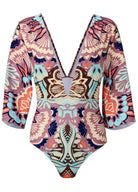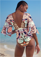 Reveal the goddess you are in this dramatic, flared-sleeve one-piece that conceals just as much as it reveals. Plunging deeply in the front and back, you'll bare some skin to soak up rays in a daring silhouette that makes sure you and your lively attitude stand out.