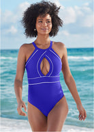 Make waves when you step onto the beach in this one-piece stunner! The layered high neckline creates a bold front keyhole, accentuating the bust with the help of contrasting-color seams that pop. Adjustable straps that crisscross in the back make sure the fit helps you to feel your best.
