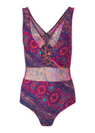 Achieve maximum swim style with minimal effort in this edgy one-piece with a plunging V-cut front and back. Printed mesh panels along the neckline, back and waist draw attention to your curves while wide shoulder straps that offer reassuring support make this suit a must for tropical getaways.