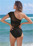 With sheer mesh cutouts and a single short sleeve, this one-piece is an edgy addition to your vacay swimwear! Revealing with its unexpected details but with just enough coverage to keep you concealed, this swimsuit has earned its place in your suitcase.
