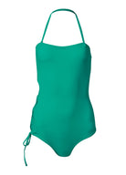 Go on, take a dip! This one-piece swimsuit has you (mostly) covered, with its daring open side that laces all the way up from the hip. The flattering bandeau-style neckline adds to the sleek silhouette that sports an optional halter strap to complements that strappy side detail. * Removable halter tie neckline * Removable padding * Moderate rear coverage * Open side with lace-up tie detail * Some colors of this style are made of recycled fabric. For more information, see MORE DETAILS * RLM: Domestic or import of nylon/spandex tricot * All Other Colors: Domestic or import of recycled nylon/spandex tricot