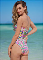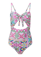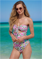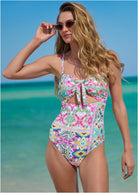 Embrace your inner goddess when you hit the beach in this chic one-piece swimsuit. With a front keyhole and a knot tie at the sweetheart neckline, this feminine suit hits in all the right places with optional straps for a custom look.