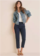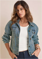 Meet your go-to denim layer for breezy days and cool nights. Designed with long sleeves, a classic collared neckline, and front pockets, this jacket is effortlessly versatile—throw it over anything for an instant style upgrade. It’s the ultimate spring denim piece that transitions seamlessly through the seasons. Pair it with jeans and your favorite sneakers for an easy, laid-back vibe.
