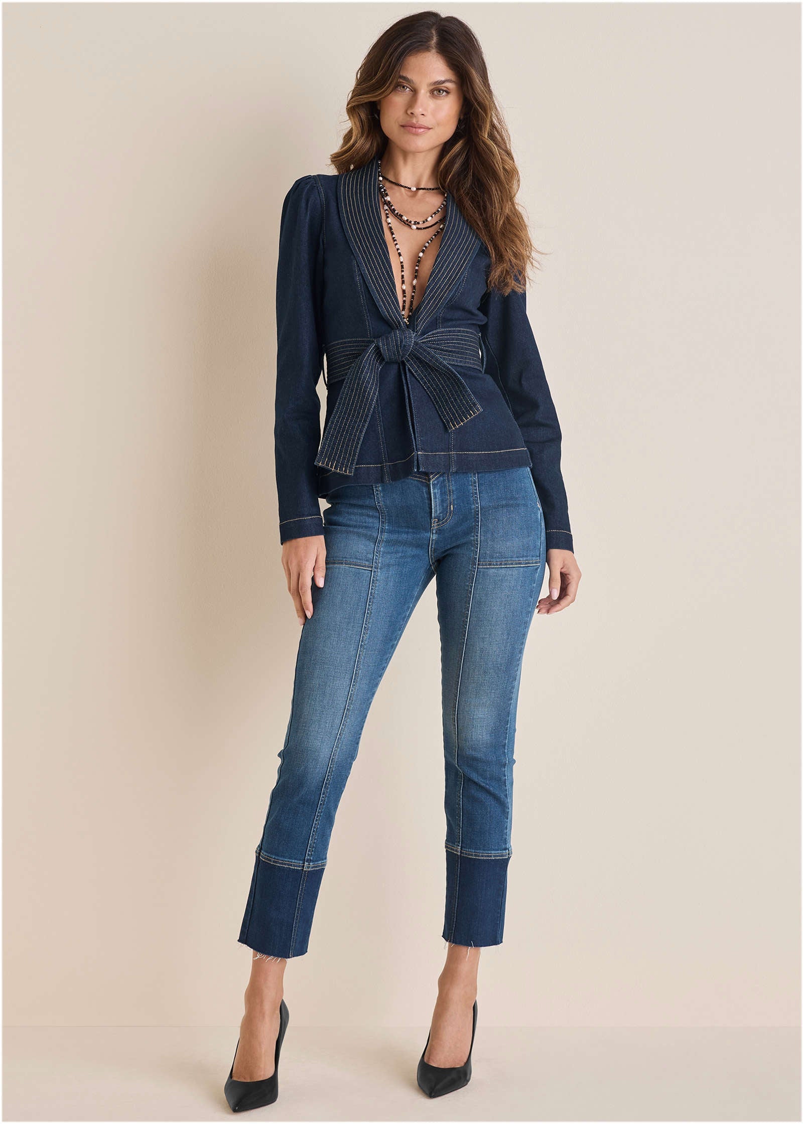 * Belt tie at waist: Cinches for a flattering fit