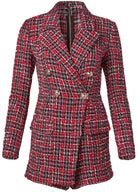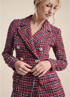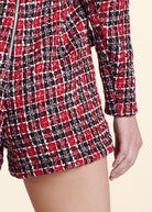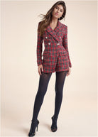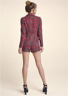 Suit up in the smart silhouette of this Tweed Button Detail Romper! Crafted in vibrant tweed, this long-sleeved skort romper boasts classic suit elements such as notched lapels and front pockets, complete with luxe double-breasted non-functional buttons at the front and a true zipper closure centered at the back.