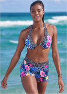 Achieve a more modest beach-day look in this pair of lined swim shorts that provide full rear coverage. The perfect choice for family time and active days, these swim bottoms boast a low-rise V-cut waistband with chic layered fabric for the appearance of a narrowed figure.