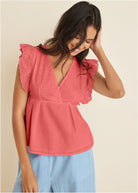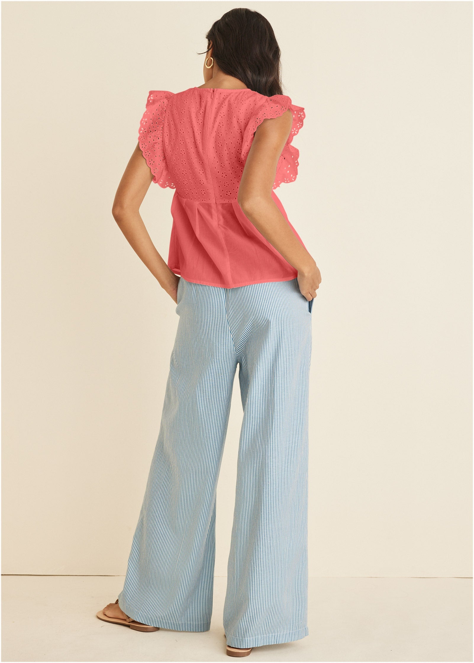 This eyelet-detailed top is as delicate as they come. Scalloped sleeves add the perfect level of frill so it turns heads without being overdone. Cinched at the waist with a faux-wrap neckline, this pretty little piece flatters before flaring into the bloused hem that's all elegance.
