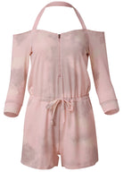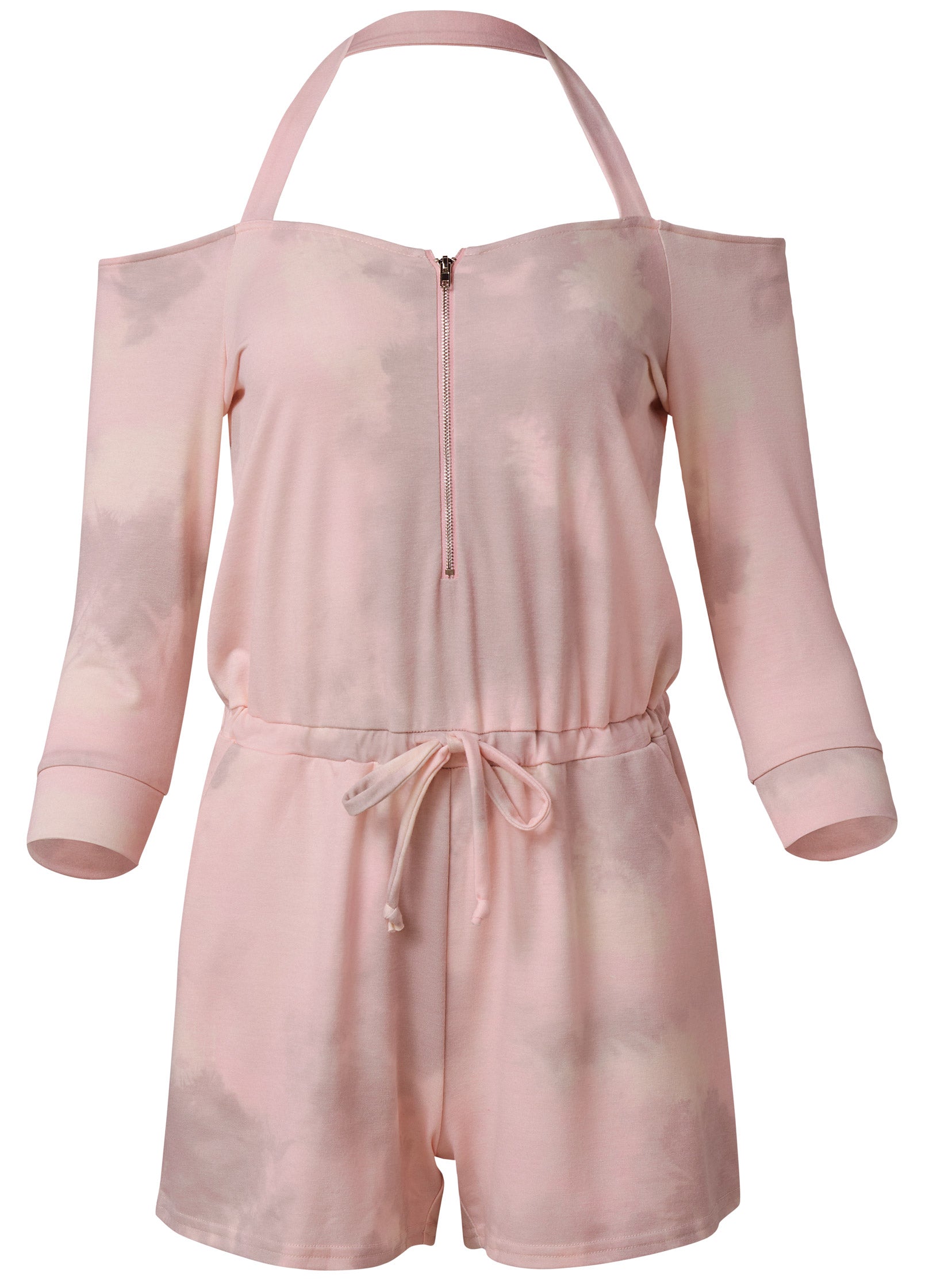 We all need "me time," and this tie-dye romper is the uniform for unwinding thanks to its soft fabric and muted tones. The off-the-shoulder neckline finishes with a halter strap and a zipper that reveals or conceals to your taste. With an elastic waist and tie detail, this casual tie-dye romper flatters.