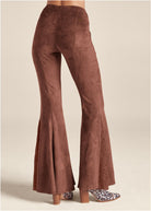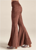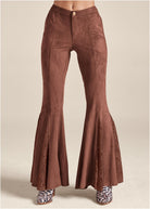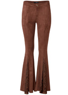 Fitted through the upper leg and hips with a statement-making flare hem for balance, these faux-suede pants are sure to attract attention! Lace insets bring flirt and a pleated effect to the wide leg openings that contrast the flattering mid-rise waist with a button and zipper closure.