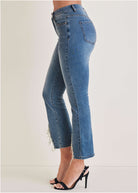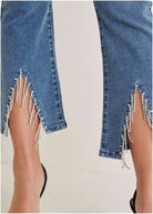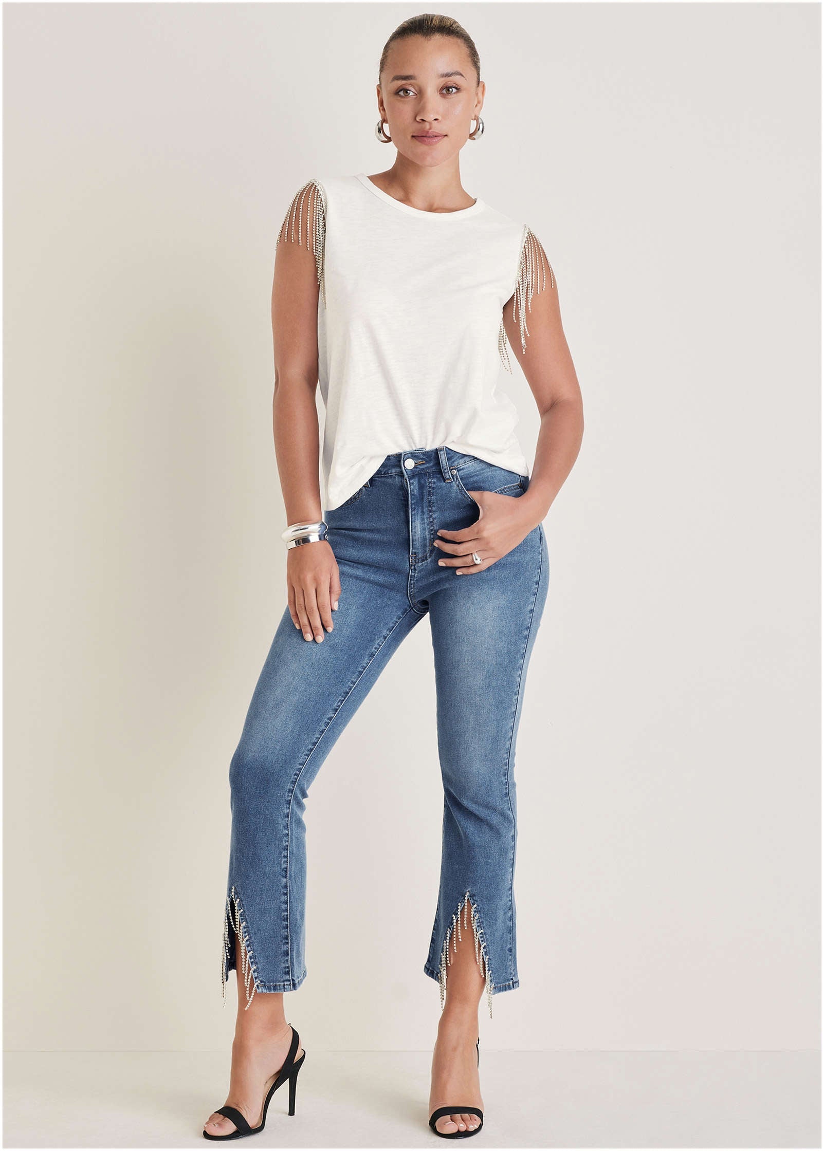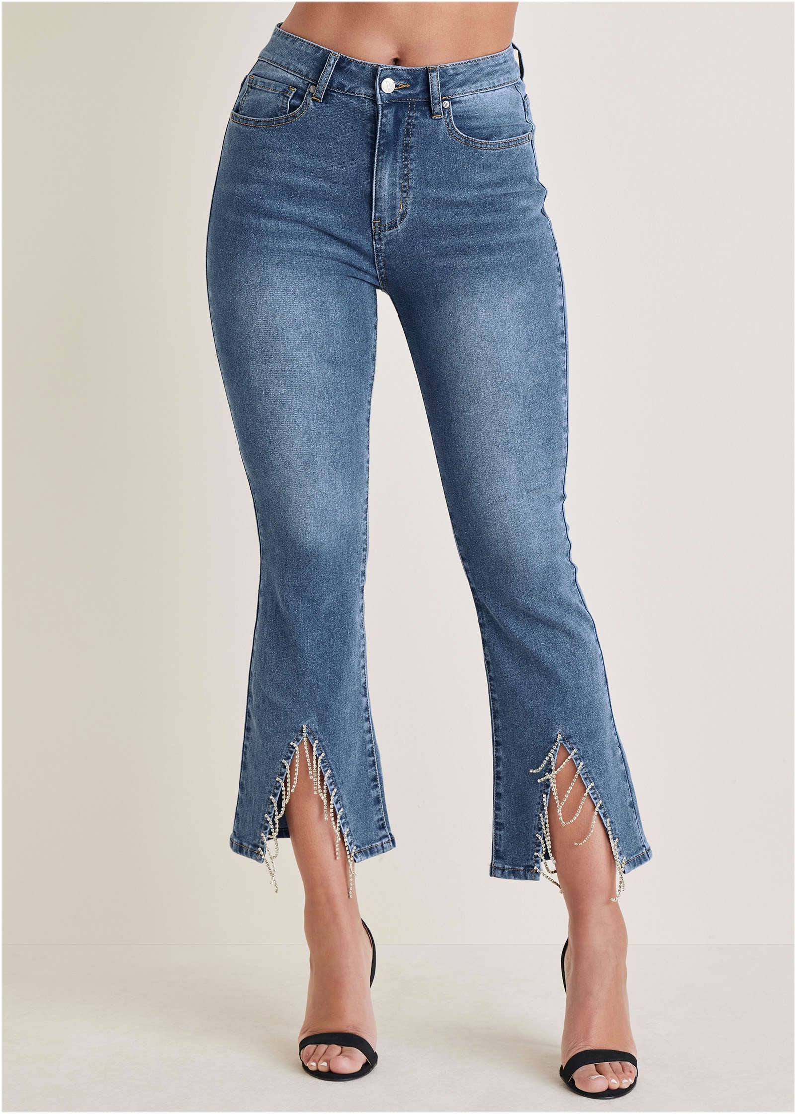 Even your go-to blues could use a dose of glam come party season, and this pair brings it! The playful kick-flare silhouette has a trendy split hem that's jazzed up with sparkling rhinestone fringe that dances with every step you take. With so much bling, these jeans are a total party, whether paired with a casual tee or a spicy night-out top and heels. If you like to have fun, these jeans are for you! * Available in plus sizes * Available in petite sizes * Inseam: 27" missy; 25" petite * Split hem * Rhinestone embellishment * Cotton/polyester/spandex. Imported