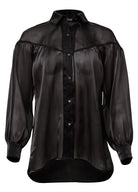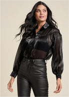 You'll definitely earn you a few double takes in this balloon sleeve top. The sheer fabric has a subtle sheen that reflects the light just enough so it's not totally see through. If you love the sheer mesh trend, but aren't ready to fully take the plunge, this is a more subtle way to rock the daring look. * Button front * Collared neck * Fabric does not have stretch * Long sleeves * Sheer * 28" approx. length; varies by size * Poly. Imported