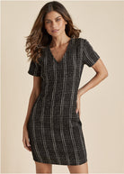 Extra! Extra! Tweed all about it! This tweed mini dress is a front page-worthy piece, toeing the line between polished and playful thanks to its always-sophisticated texture. Short sleeves keep things professional, while solid knit side panels assure it works 'round the clock to flatter your figure. * Available in plus sizes * Item runs large; size down for a better fit * V-neck * Short sleeves * Mini length: 37"from shoulder * Fully lined * Polyester. Imported