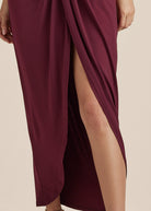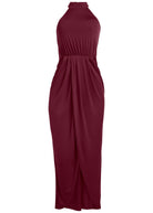 Meet your next showstopper. This long, drape-style sleeveless dress stuns with its high choker-style neck and long dramatic hem. The high slit at the front reveals a pop of leg as you step out, while the cinched elastic waist assures an elegant and structured silhouette that will keep all eyes on you. * Sizes: XS (2), S (4-6), M (8-10), L (12-14), XL (16) * Plus sizes: 1X (18-20), 2X (22-24), 3X (26-28) * Size down for a more fitted look * Elastic at waist; belt not included * Invisible zipper closure at back * Mini cut lining * Hits at mid thigh at shortest point 34" * Maxi length approx. 58" * Poly/elastane. Imported